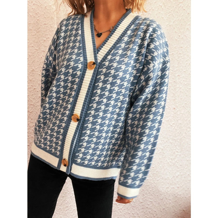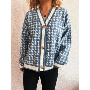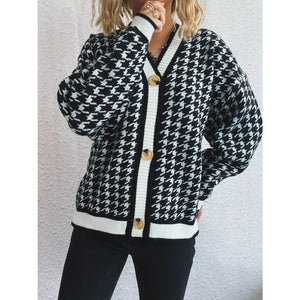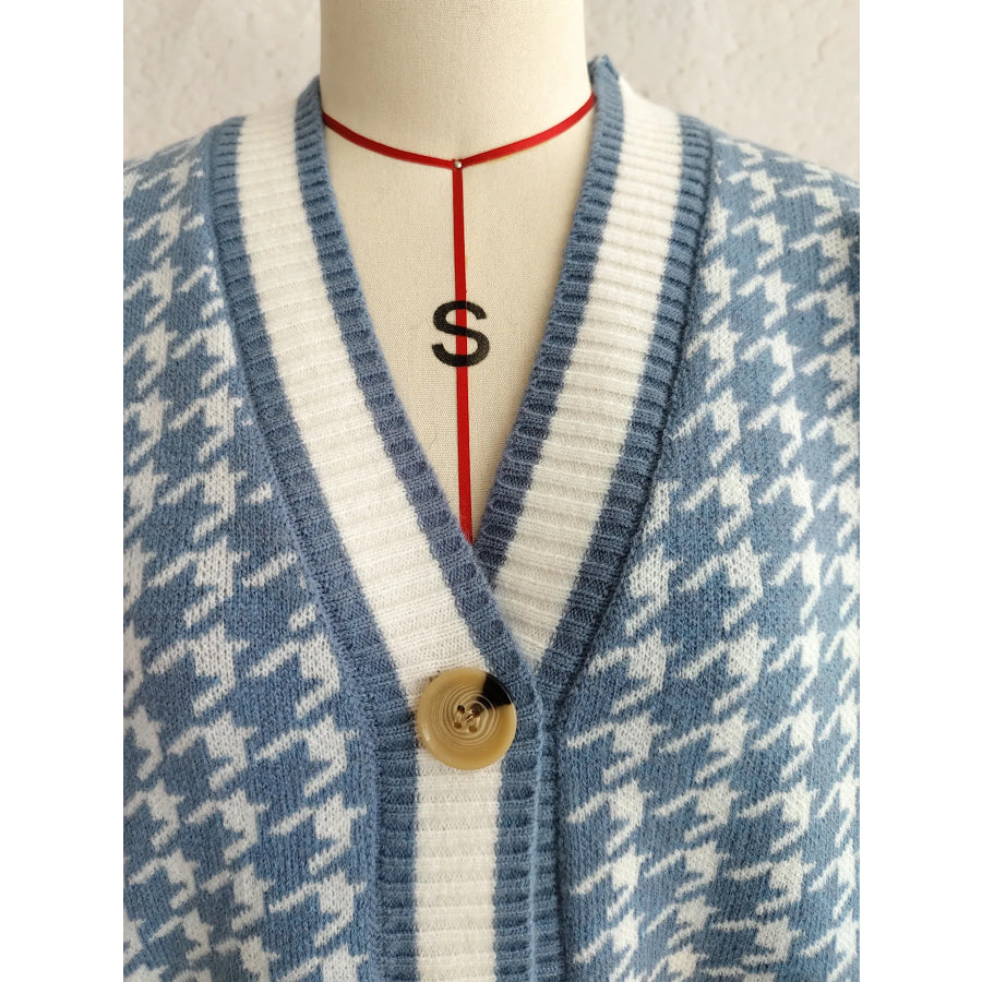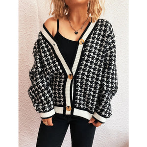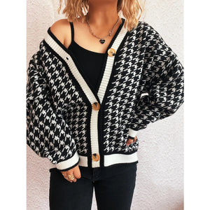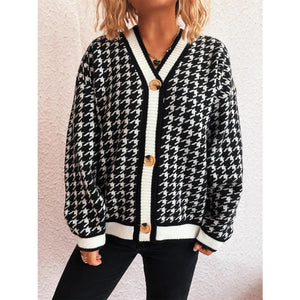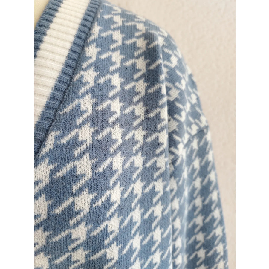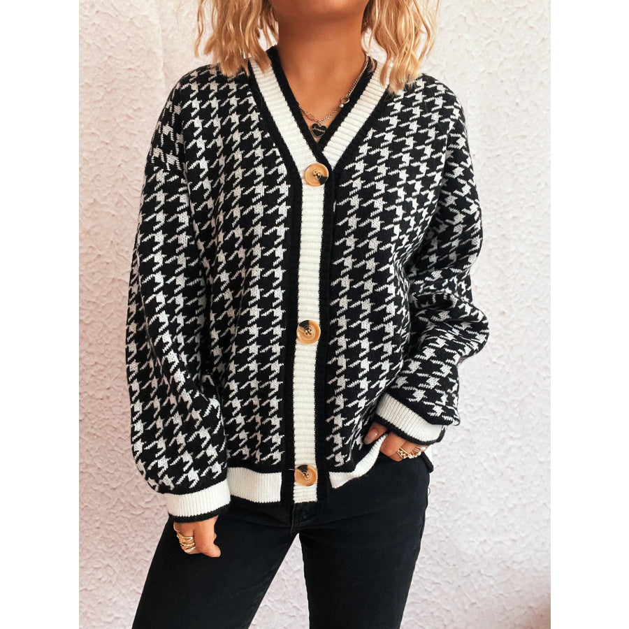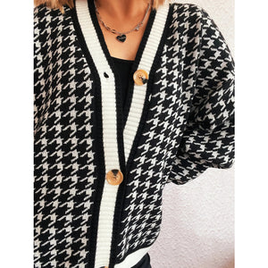 Houndstooth Pattern V-Neck Button-Up Cardigan