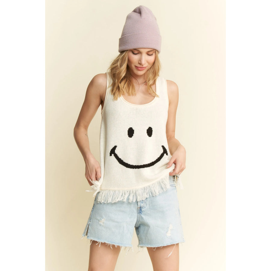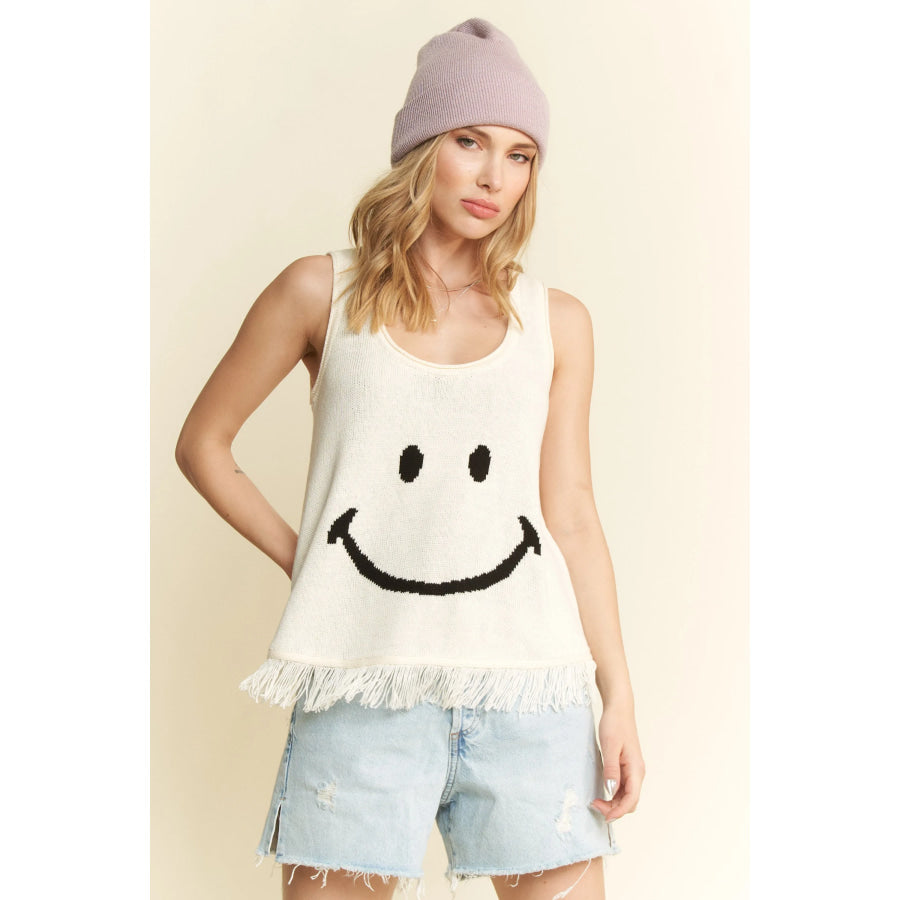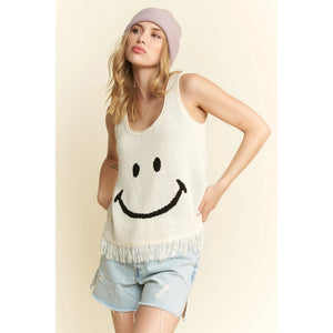 This charming tank top features a playful black smiley face graphic on a soft white knit fabric. The relaxed-fit silhouette offers comfortable all-day wear, while the decorative fringe hem adds a bohemian touch. Made from lightweight, breathable material perfect for warm weather. The scoop neckline and sleeveless design make it ideal for layering or wearing alone. A fun, casual piece that brings personality to any outfit.