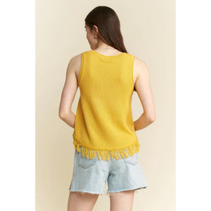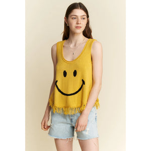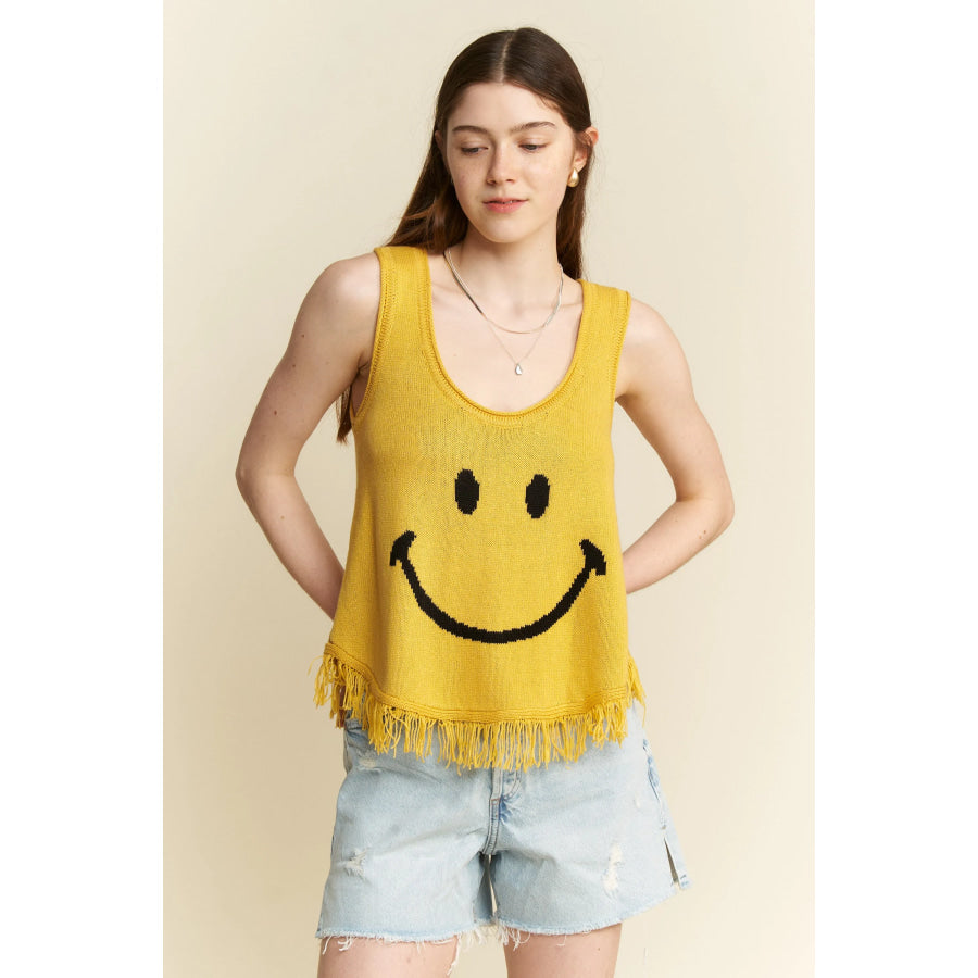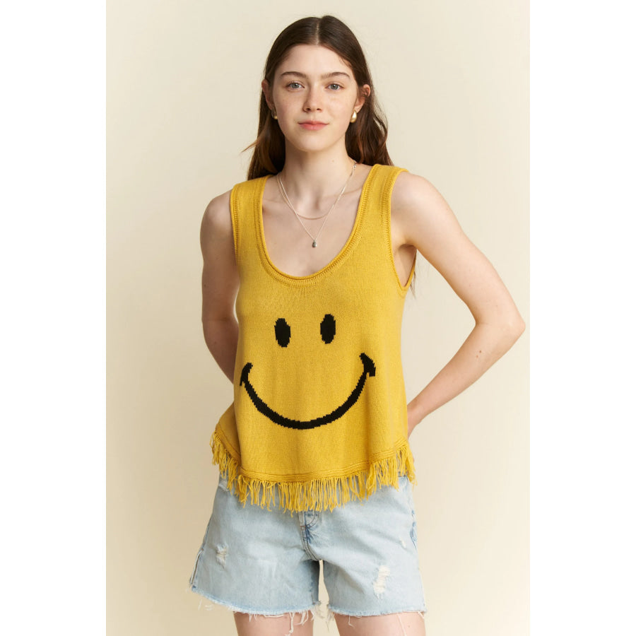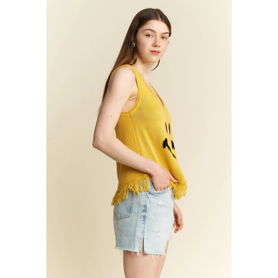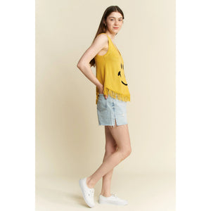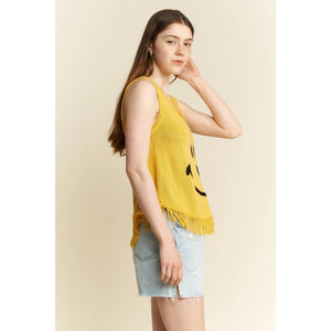 This cheerful Jade By Jane tank top features a bold black smiley face graphic on soft, lightweight cotton-blend fabric in a vibrant mustard yellow. The relaxed fit silhouette is enhanced by a playful fringe hem detail that adds movement and bohemian flair. Perfect for summer festivals, beach days, or casual outings, this versatile piece pairs effortlessly with denim shorts, skirts, or layered over swimwear. The comfortable scoop neckline and sleeveless design ensure all-day comfort in warm weather.