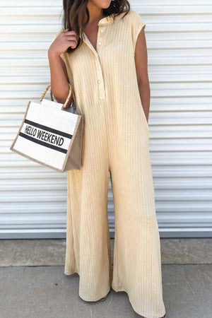 Jet Stream Half Buttons Ribbed Knit Wide Leg Jumpsuit