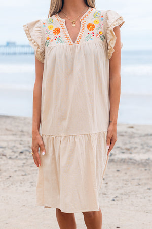 Jet Stream Linen Embroidery Split Neck Pom Pom Ruffle Sleeves Flowy Short Dress