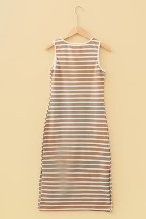 Khaki Stripe Tie V Neck Sleeveless Side Slit Midi Dress