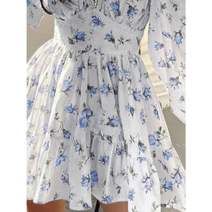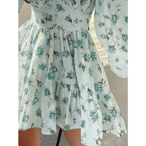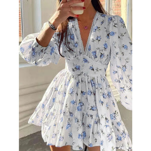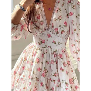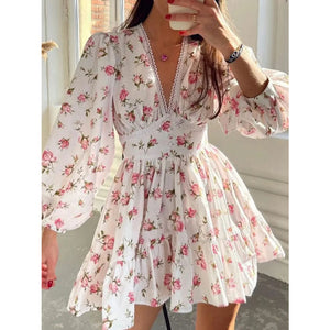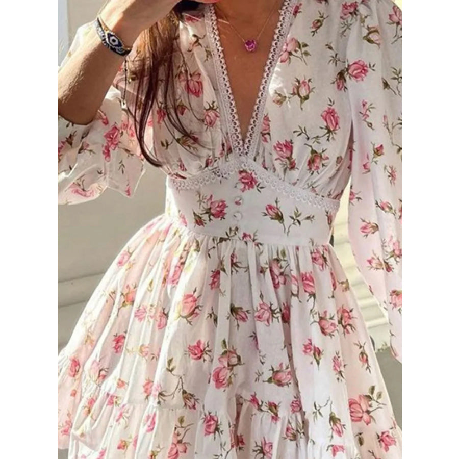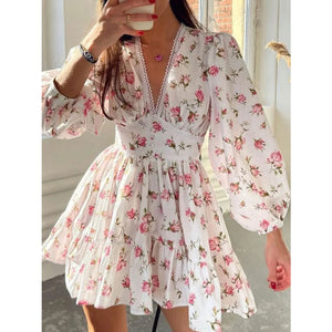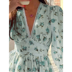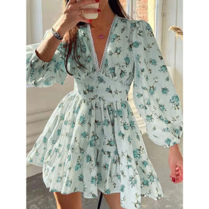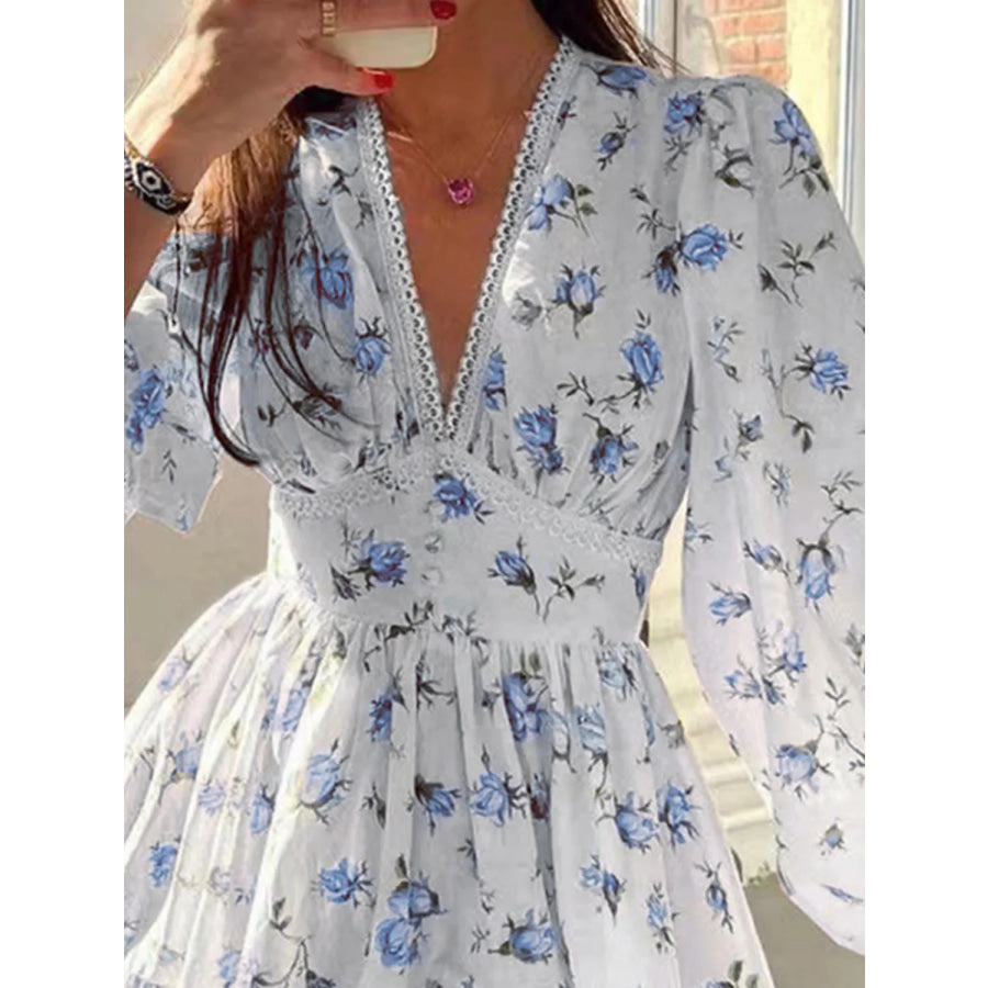 Lace Detail V-Neck Balloon Sleeve Dress