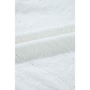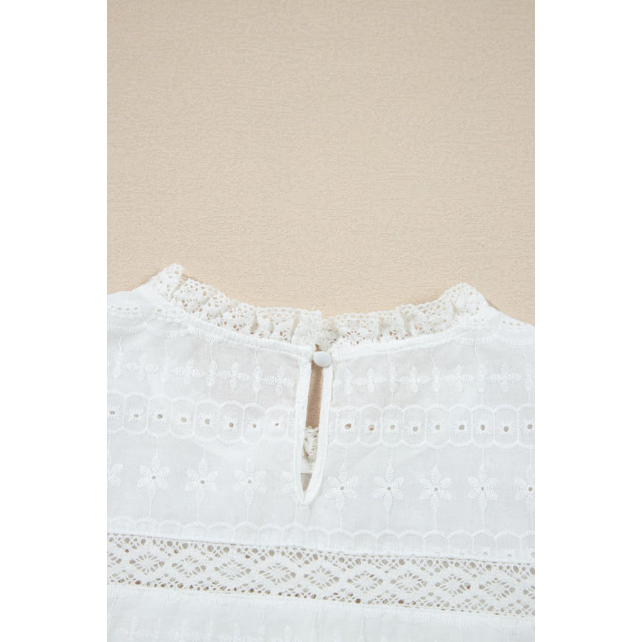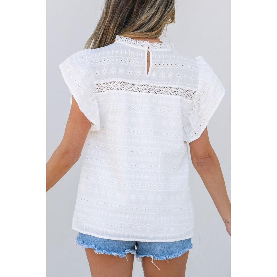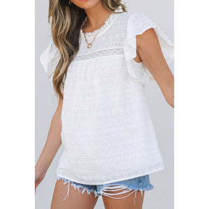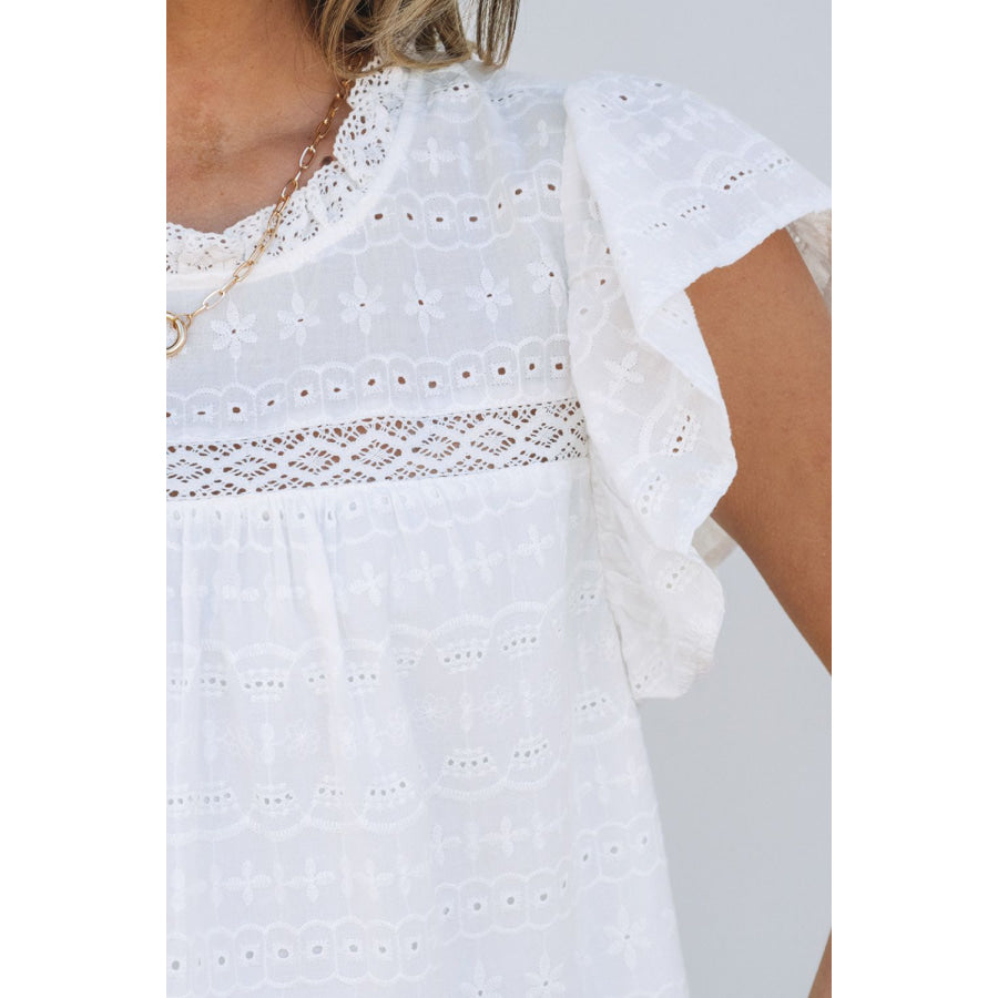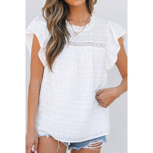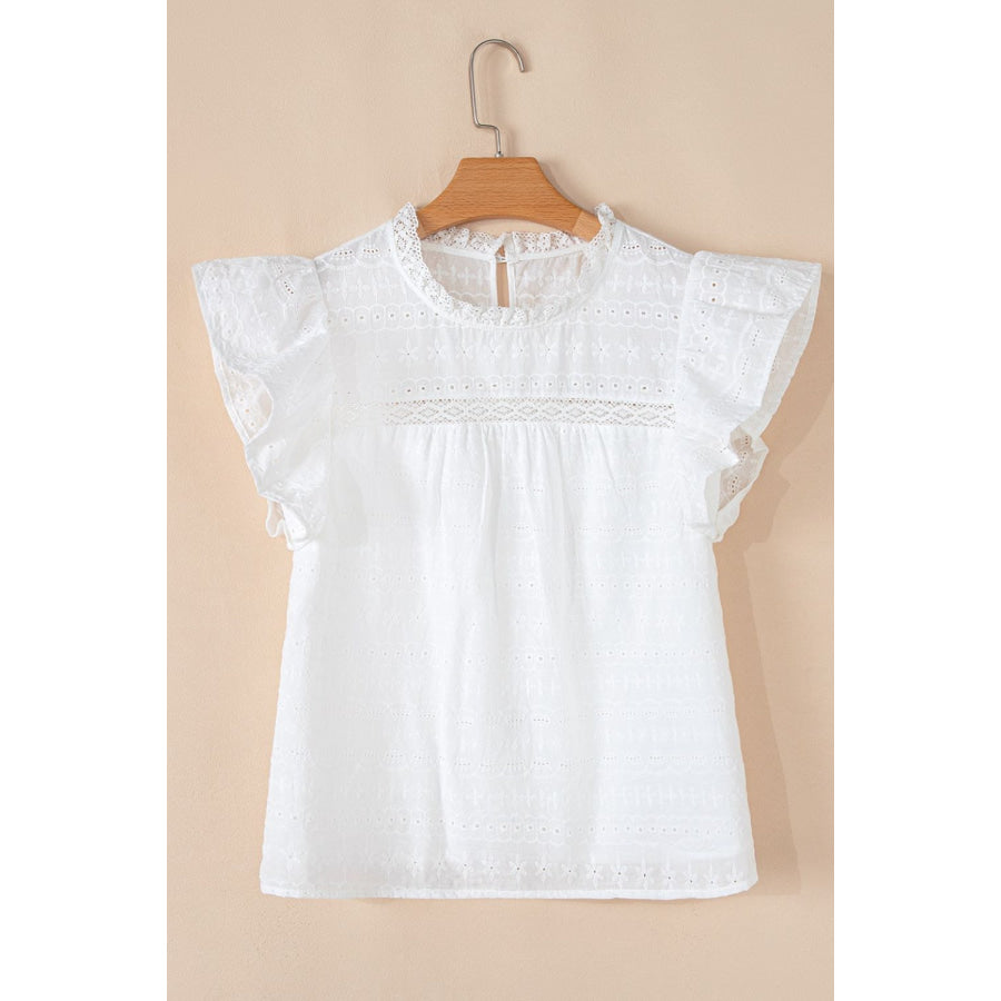 Lace Round Neck Flutter Sleeve Eyelet Blouse