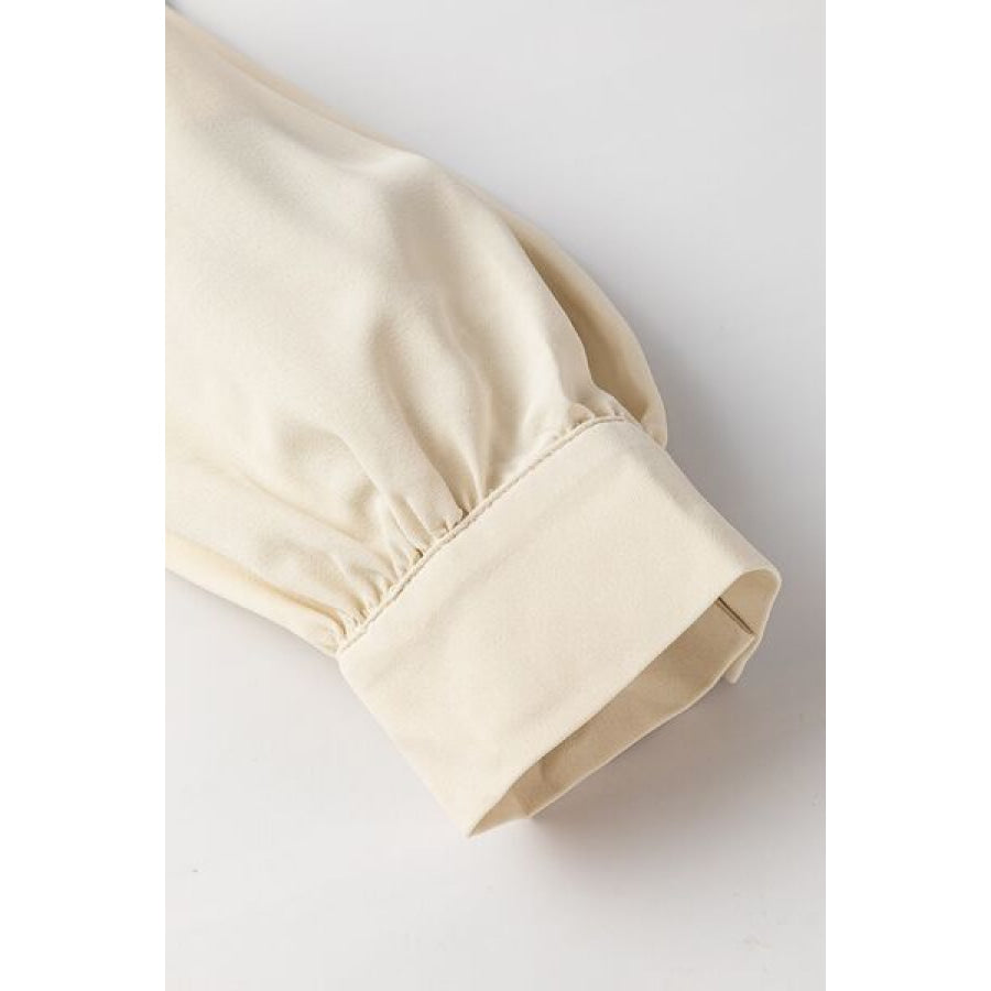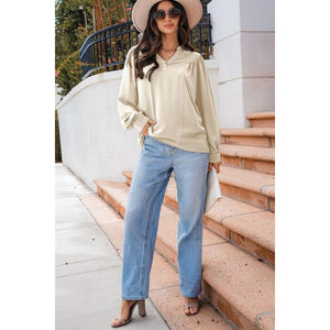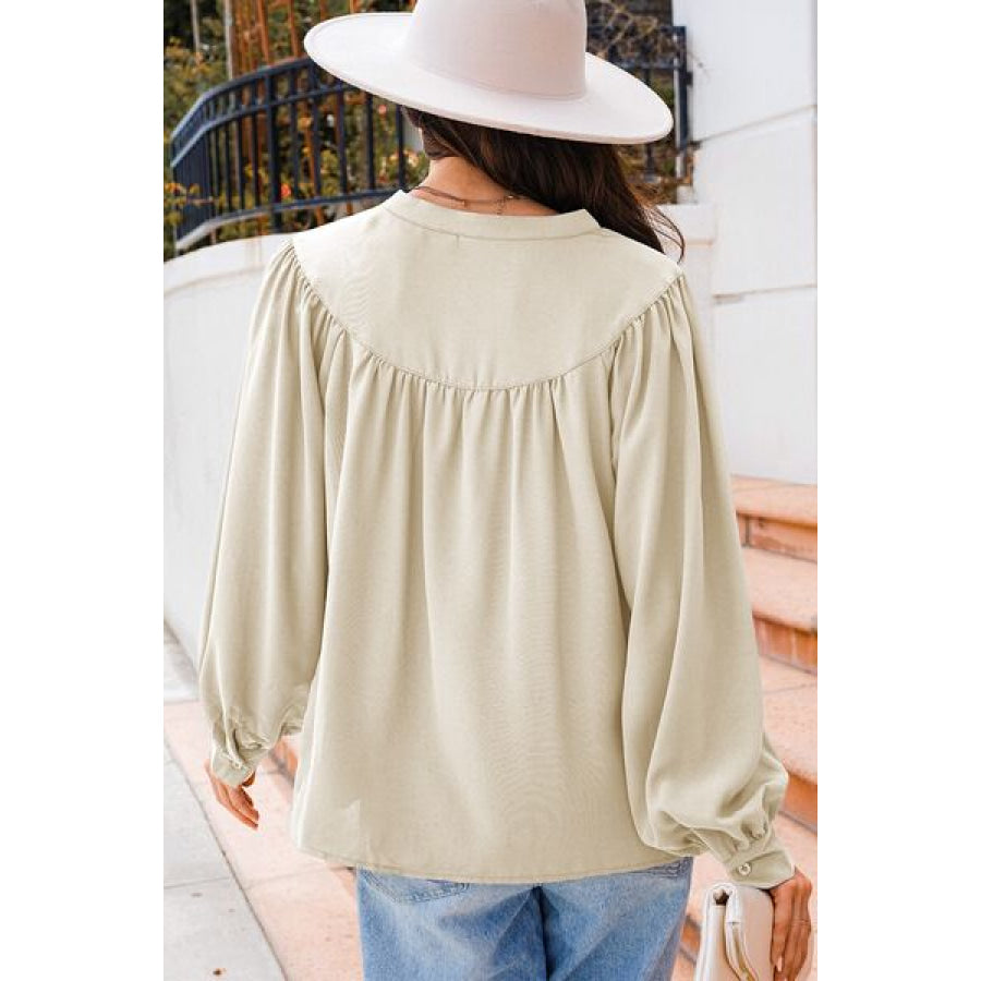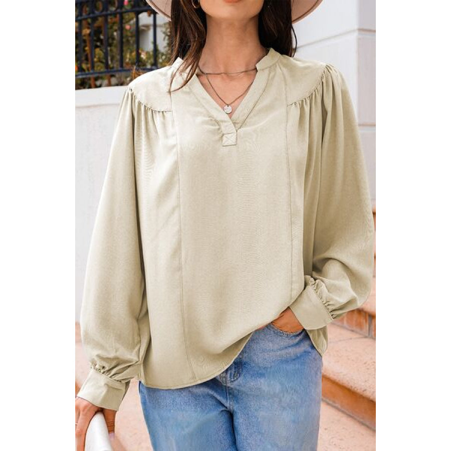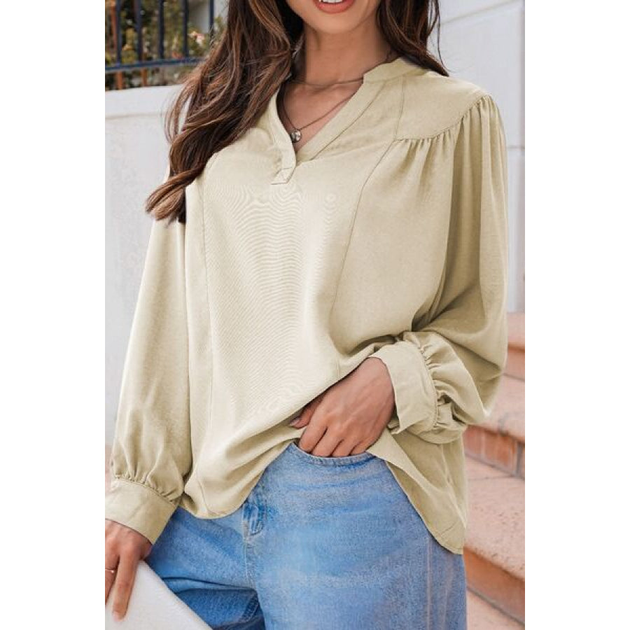 Lantern Sleeve Notched V Neck Ruched Blouse