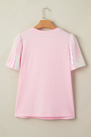 Light Pink Three Sweet Hearts Printed Sequin Trim Contrast Sleeve Patchwork Tee