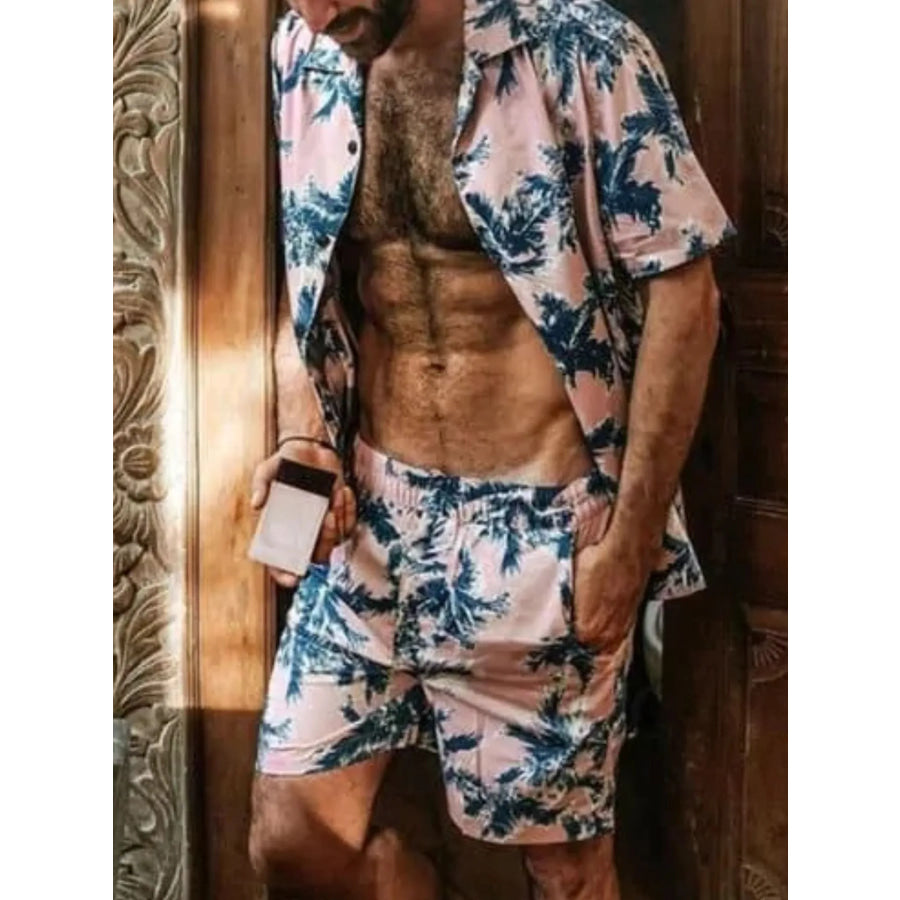 Men's Full Size Tropical Print Hawaiian Style Top and Shorts Set Plus Size