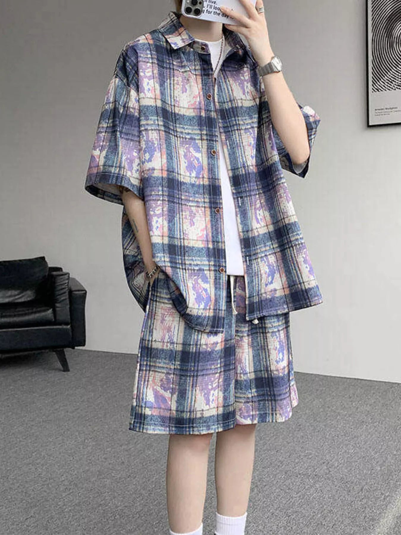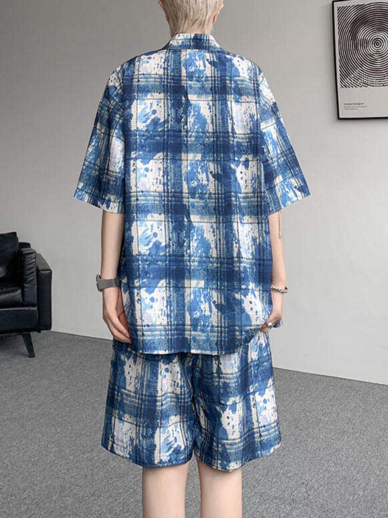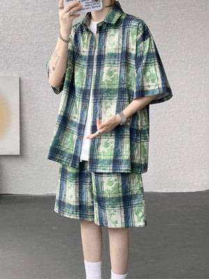 Men's Plus Size Casual Plaid Print Shirt & Shorts Set