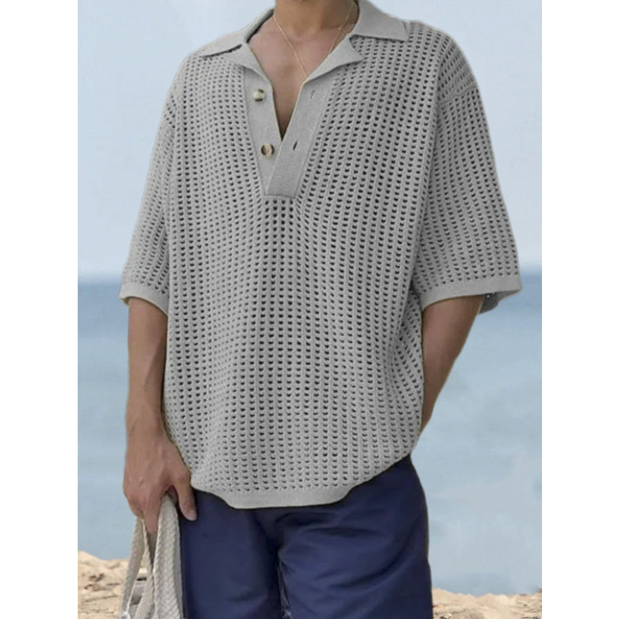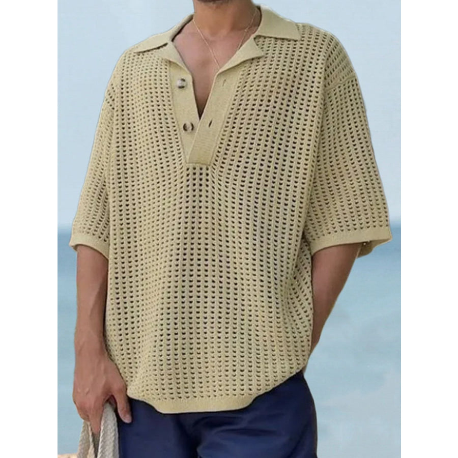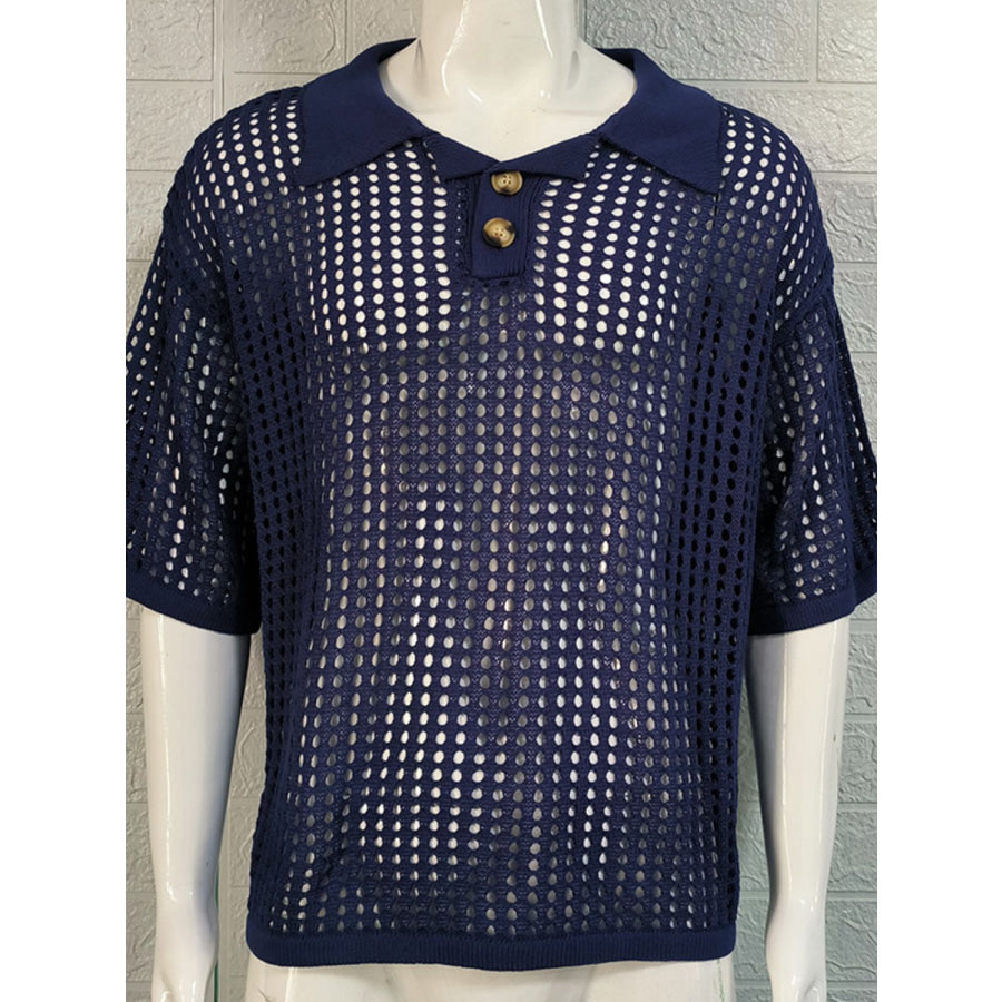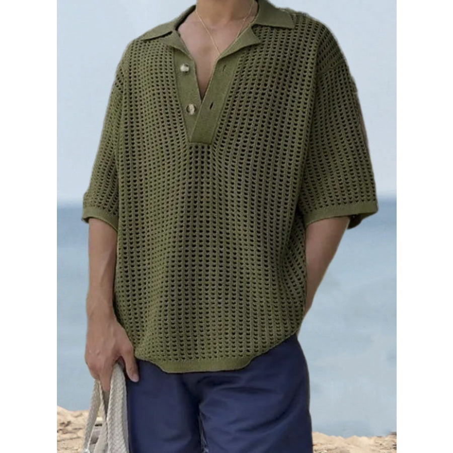 Men's Plus Size Openwork Collared Neck Quarter Button Knit Polo