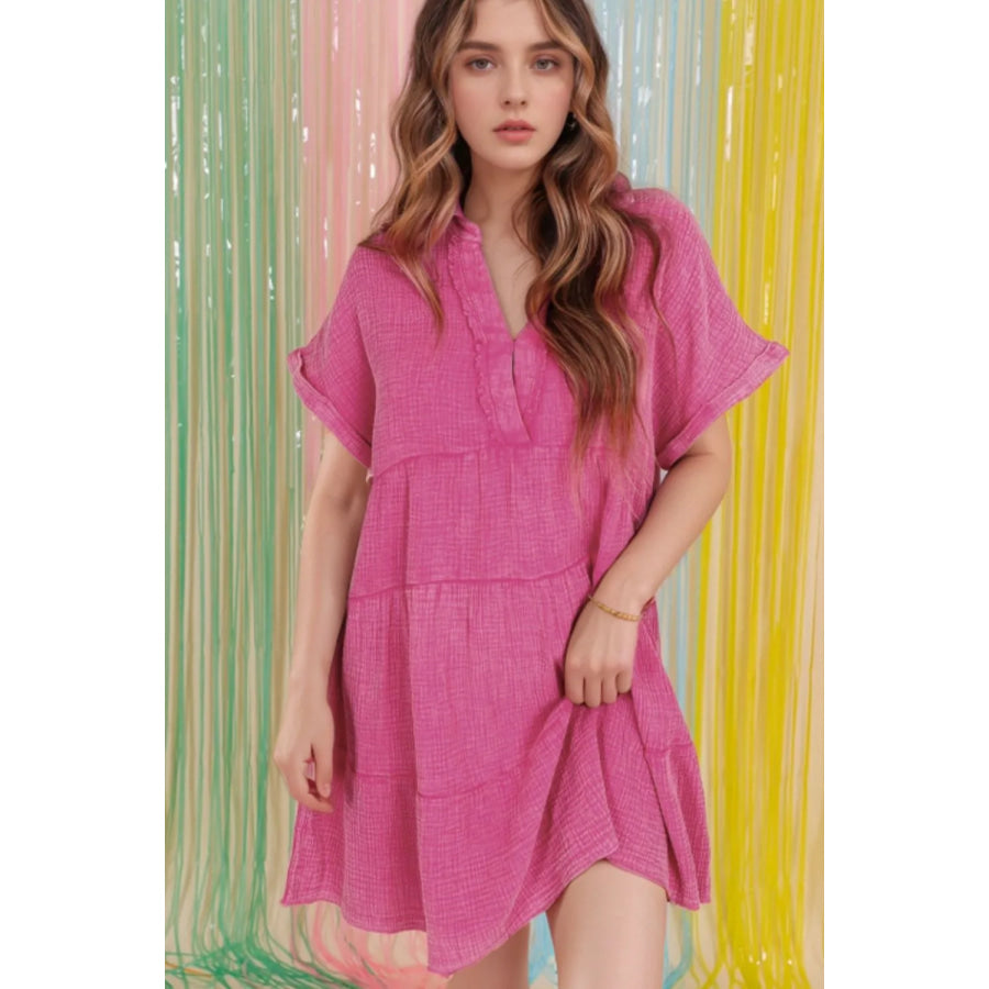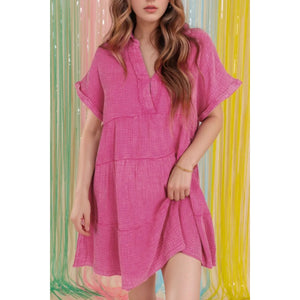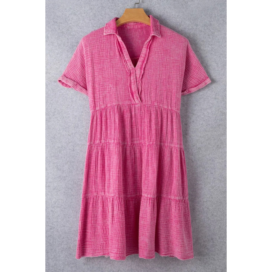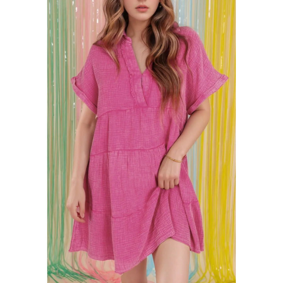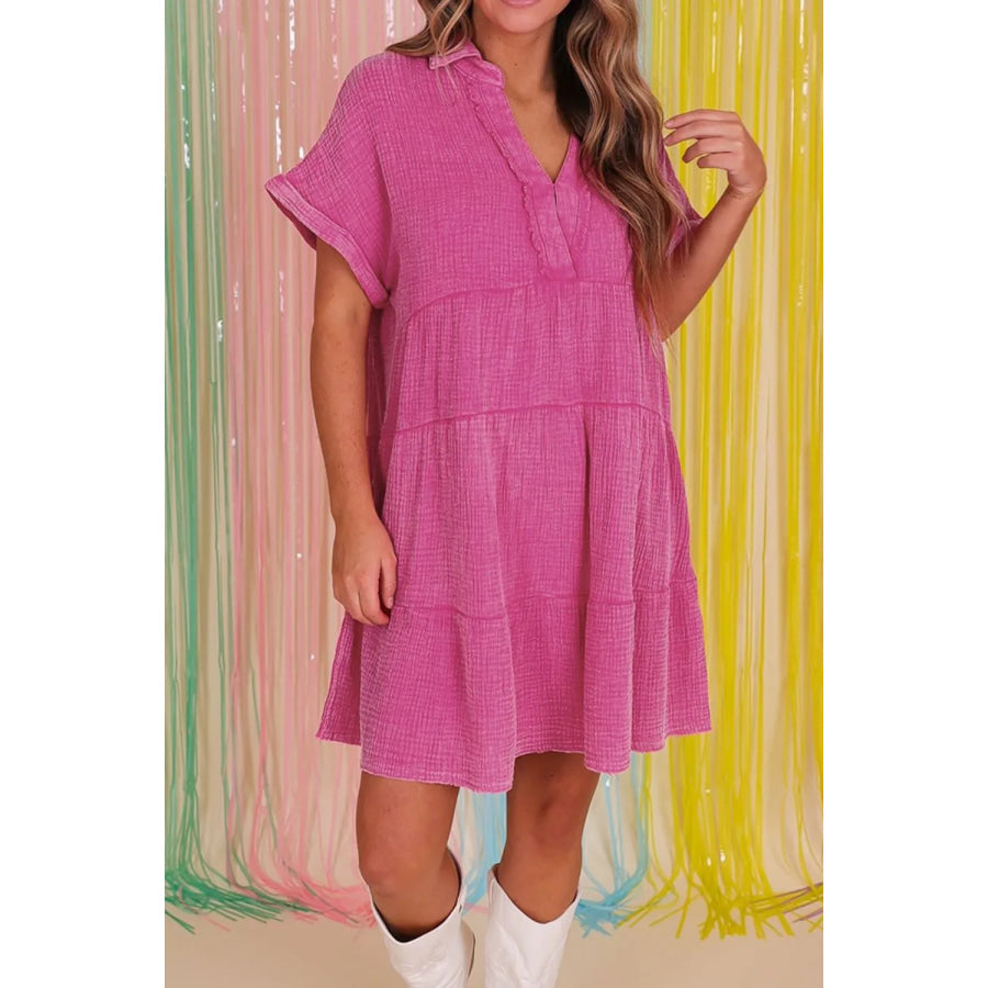 Mineral Wash Crinkle Split Neck Raw Hem Tiered Dress