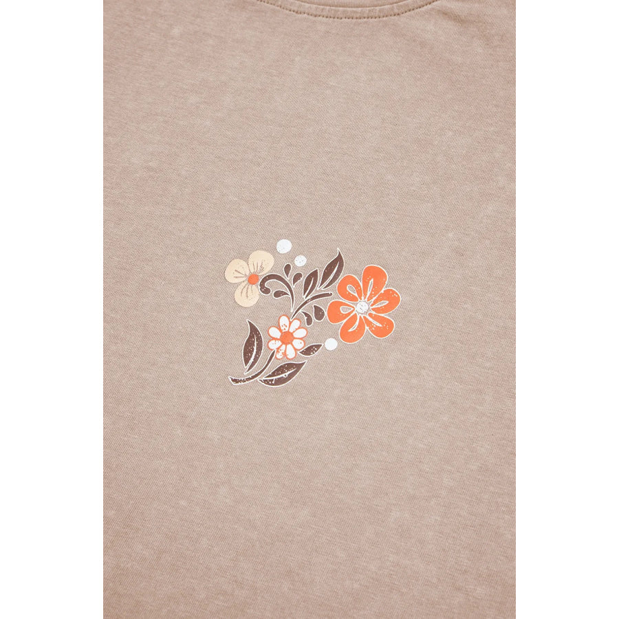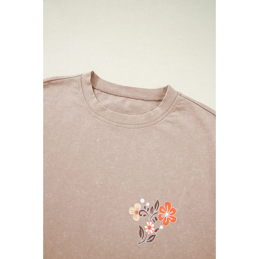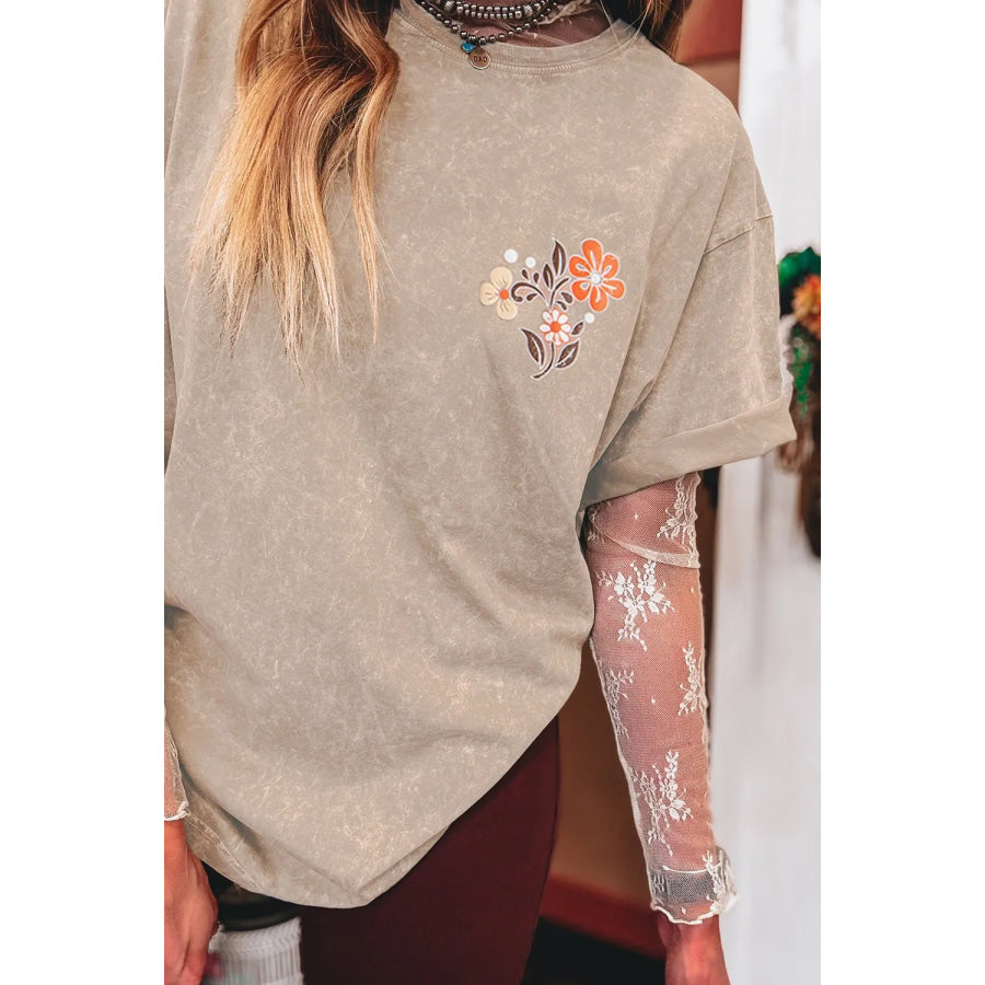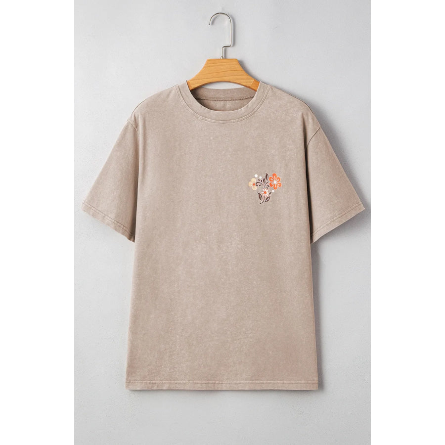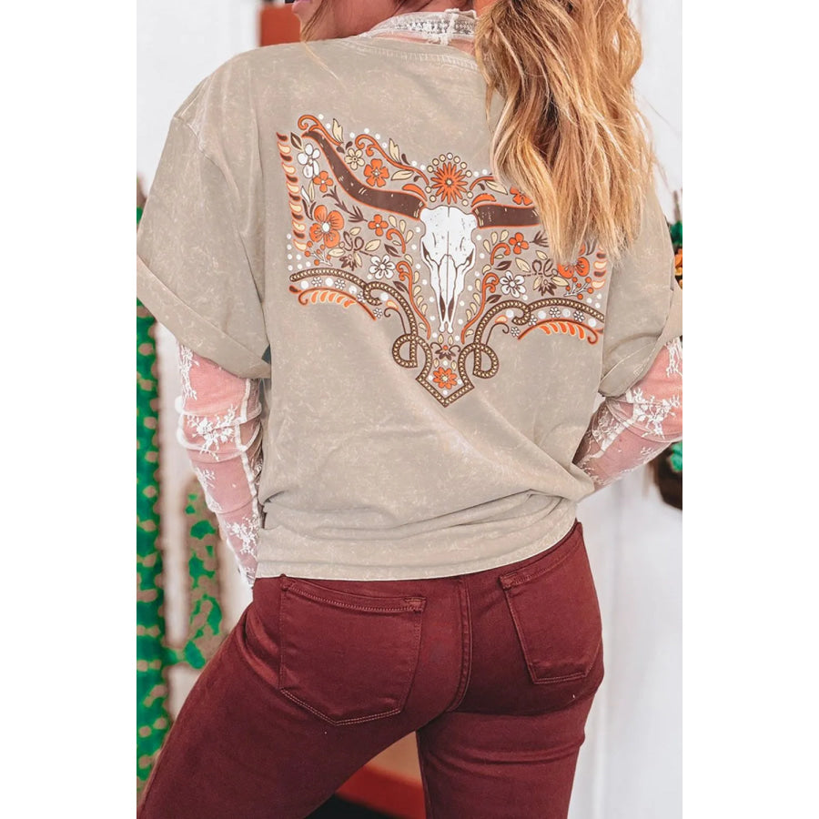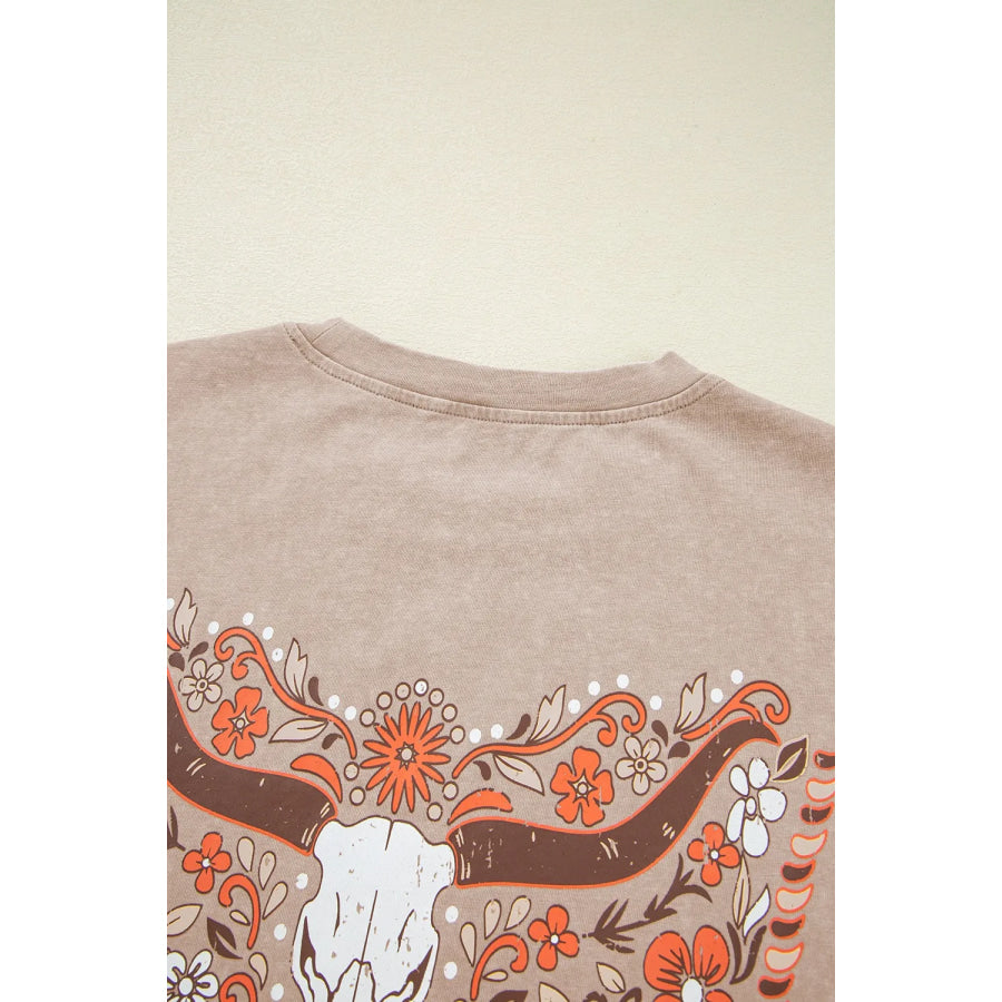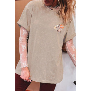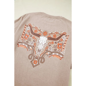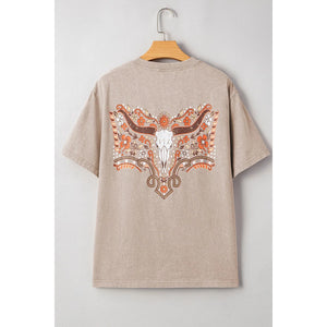 Mineral Wash Floral Steer Head Printed Back Western Fashion Tee
