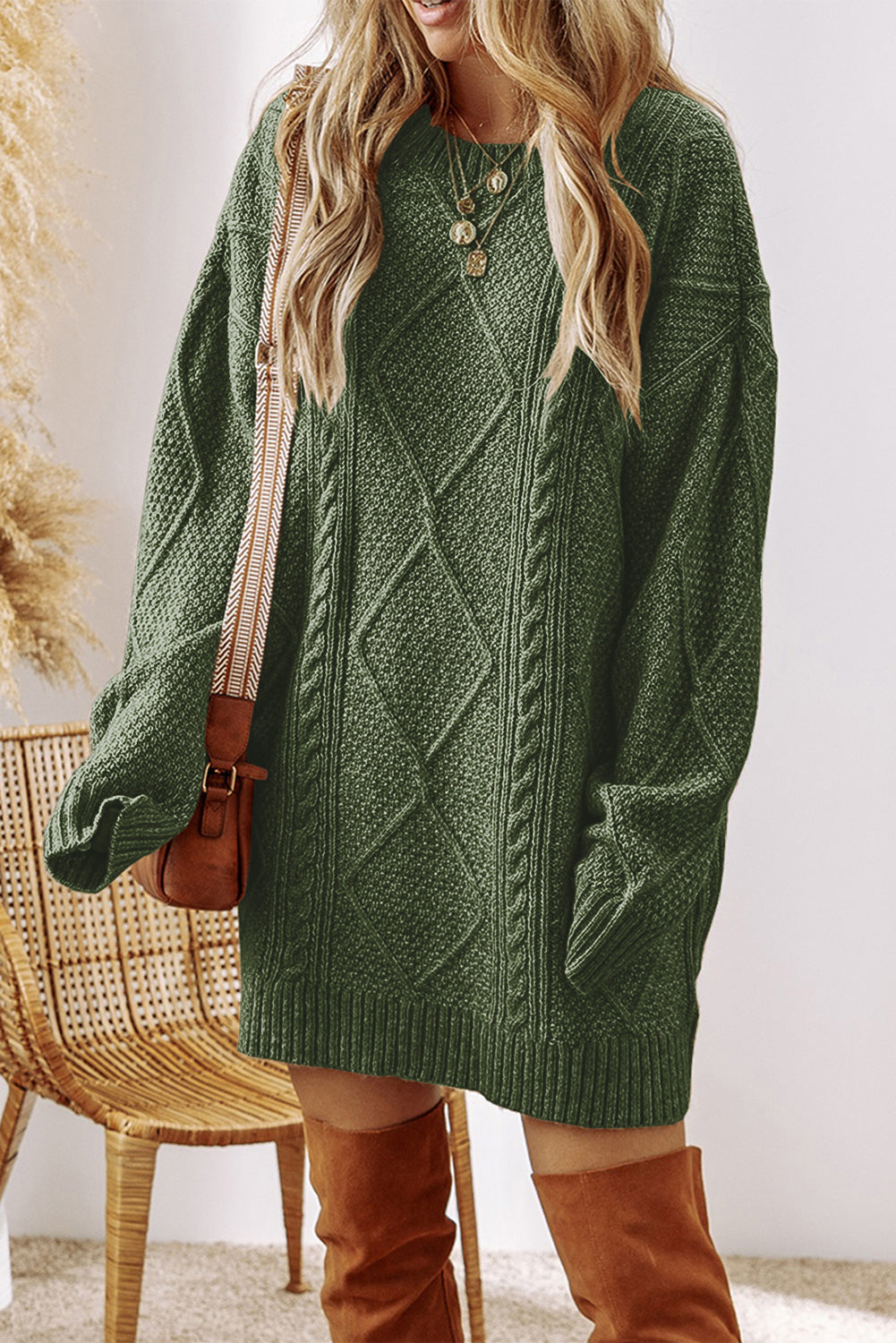 Mist Green Cable Knit Drop Shoulder Loose Fit Sweater Dress