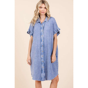 This mini-length shirt dress is crafted from mineral washed cotton gauze fabric, offering a soft and lightweight feel. Featuring a classic collar and a button-down front placket, it combines style and practicality. The mini ruffle sleeve detail adds a charming touch, while the short sleeves keep it airy and comfortable. With convenient side pockets and a shirt-tail hem, this relaxed fit dolman style dress is perfect for casual outings or warm-weather events. Pair it with sandals for a chic and effortless look!