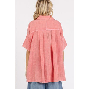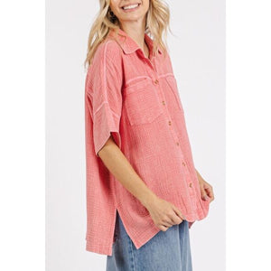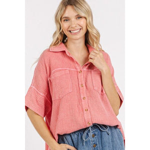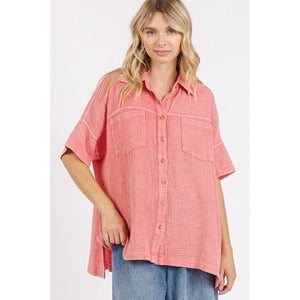 The Mineral Wash Gauze Oversized Short Sleeve Shirt is a must-have piece for those seeking comfort and style. Crafted from gauzy fabric with a mineral wash finish, this shirt exudes a relaxed and casual vibe. The oversized fit adds a modern and trendy touch, perfect for effortless, laid-back outfits. The short sleeves provide a breathable and airy feel, making it ideal for warmer days. Pair this shirt with your favorite denim or leggings for a chic and comfortable look. Elevate your casual wardrobe with the Mineral Wash Gauze Oversized Short Sleeve Shirt as a versatile and on-trend staple.