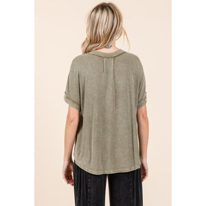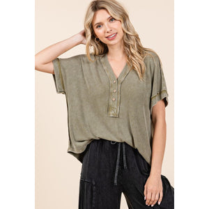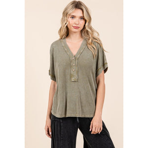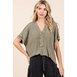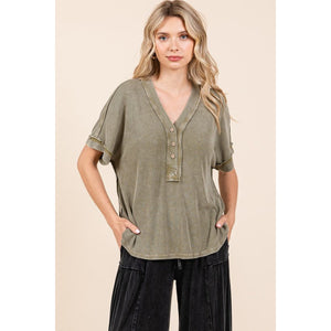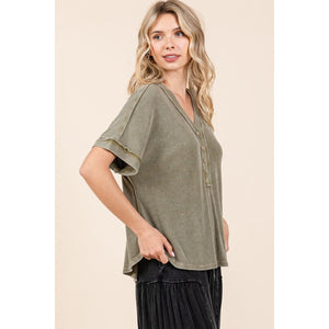 Mittoshop Mineral Wash Henley Short Sleeve Waffle Knit Top