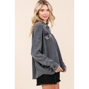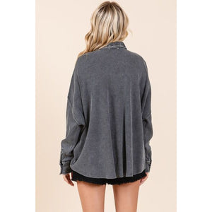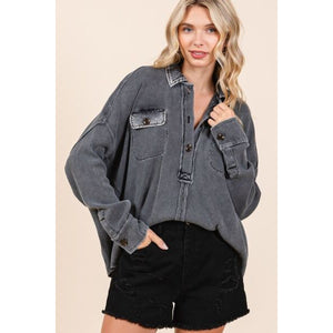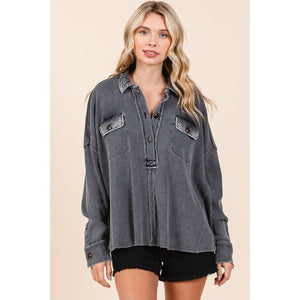 The Mineral Wash Waffle Knit Collared Neck Henley Top is a versatile and stylish addition to your wardrobe. The mineral wash finish adds a trendy touch to the classic Henley design. The waffle knit fabric provides a textured look and a cozy feel. The collared neckline adds a touch of sophistication, making this top suitable for a variety of occasions.