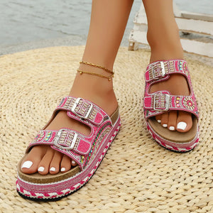 These fashionable platform sandals feature a unique bohemian design with ethnic-inspired embroidery and decorative elements. The double buckle straps provide secure adjustability while the platform sole offers comfortable elevation. Made with quality synthetic materials, these sandals combine style with durability. The detailed embellishments include metallic studs and intricate pattern work, perfect for casual summer outfits. The textured sole ensures stability, while the neutral color palette makes them versatile for various occasions. The platform design provides both comfort and style, making these sandals an ideal choice for everyday wear.