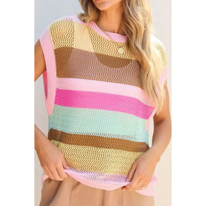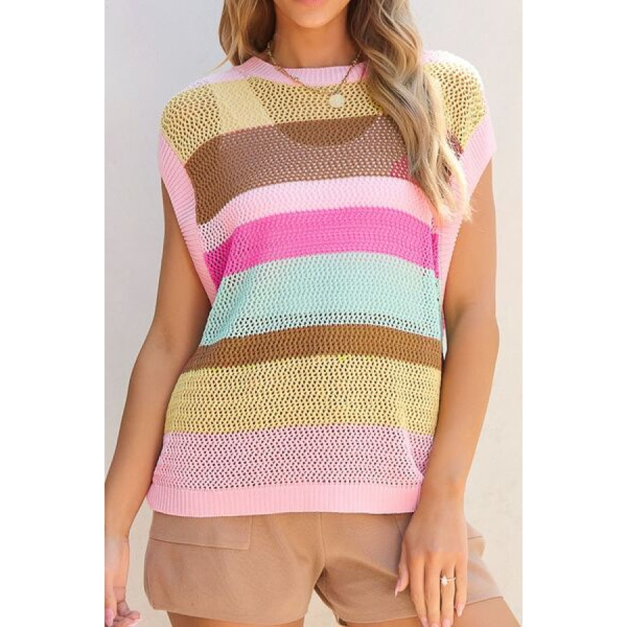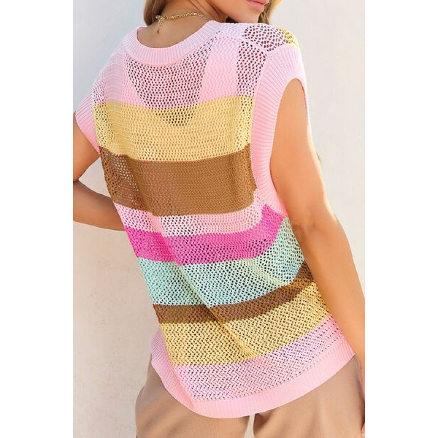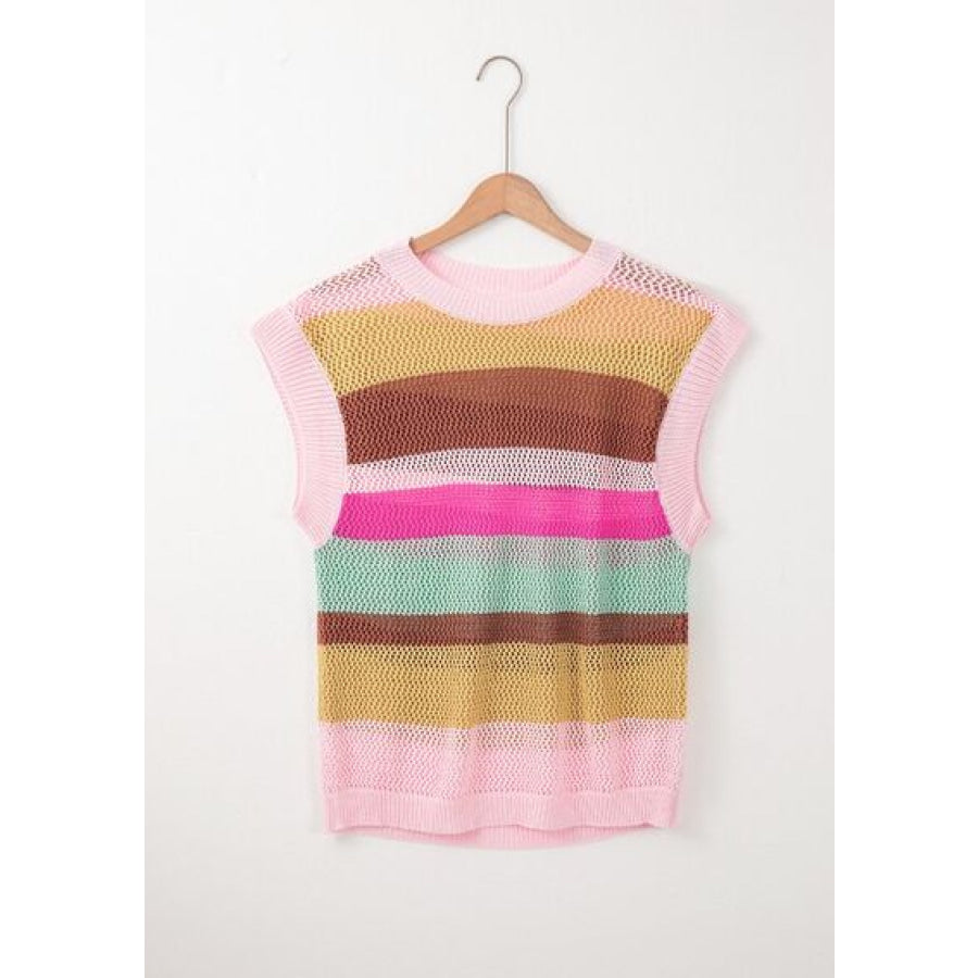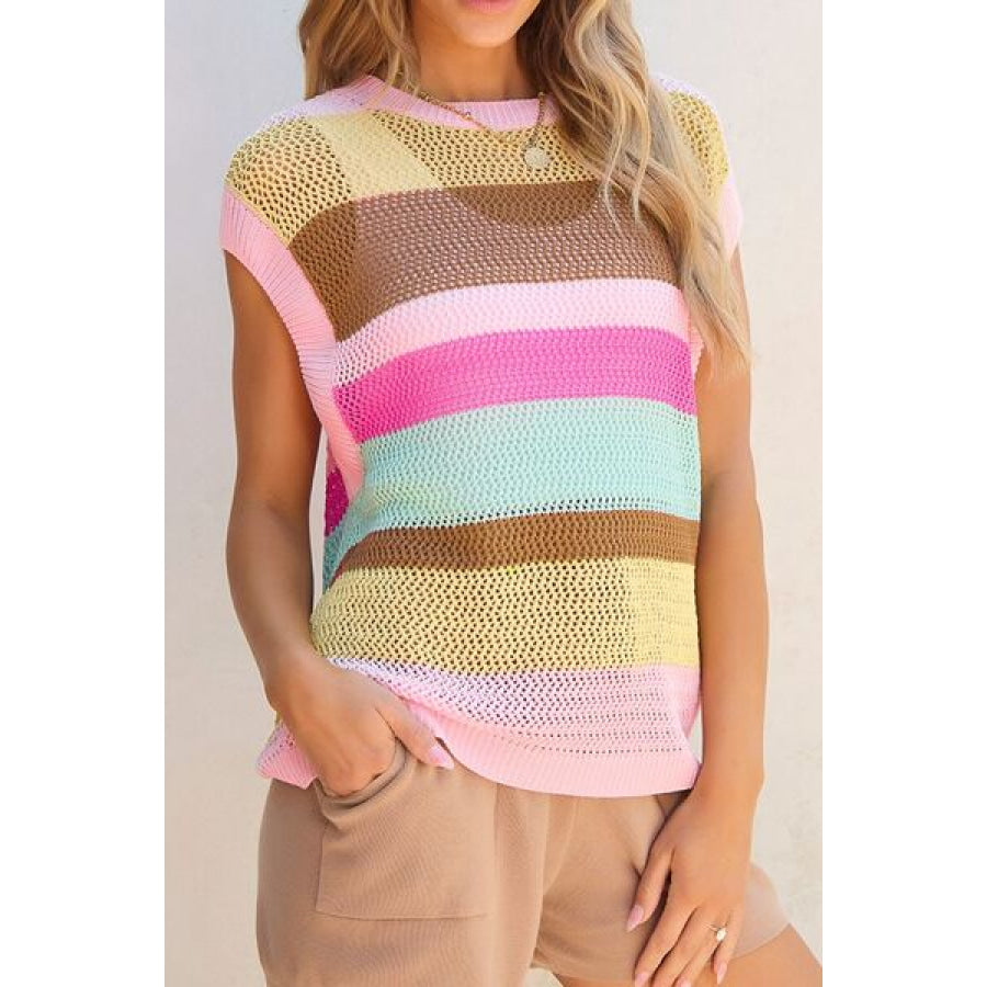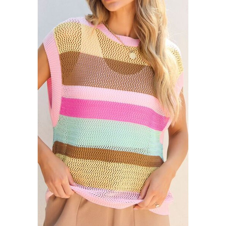 Openwork Round Neck Striped Knit Cover Up