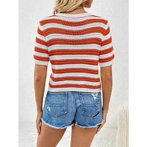 Openwork Striped Round Neck Short Sleeve Knit Top