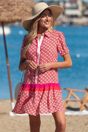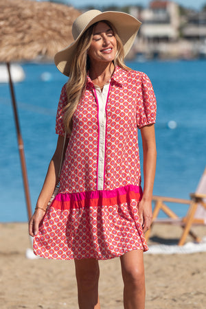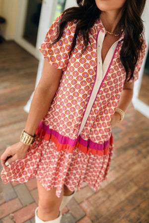 Orange Geometric Floral Print Color Block Trim Button Front Ruffle Hem Dress