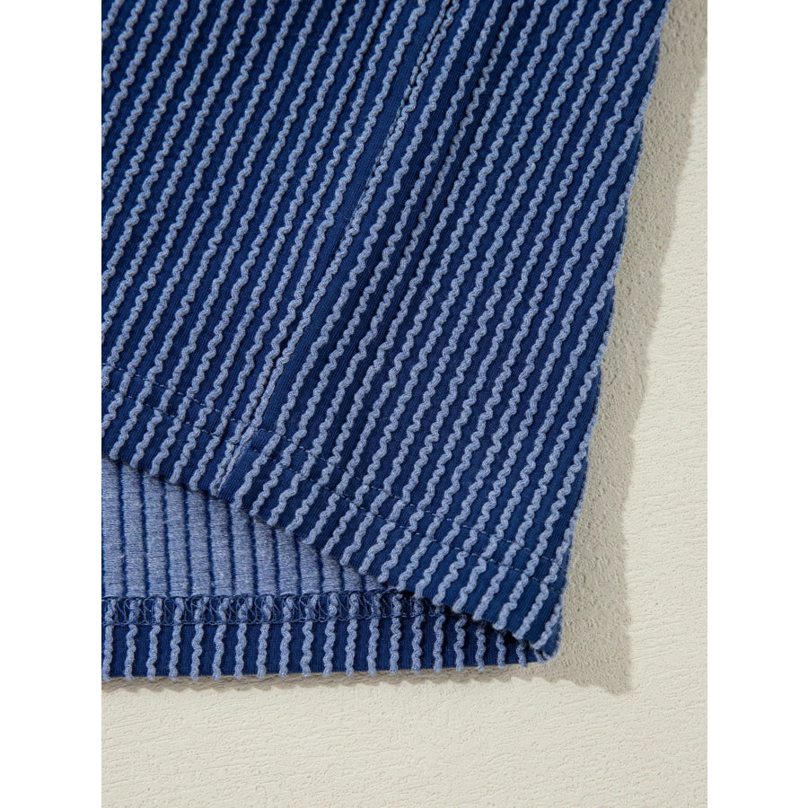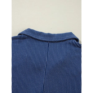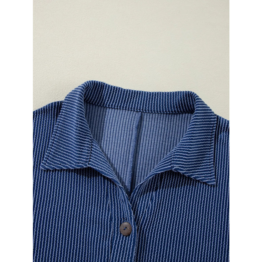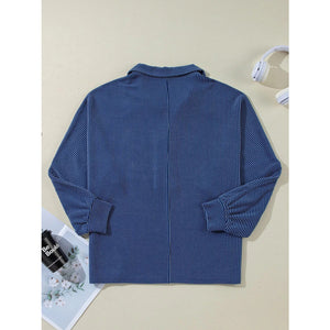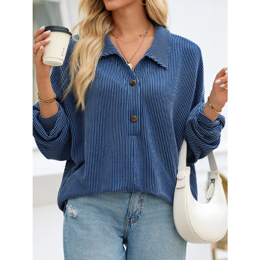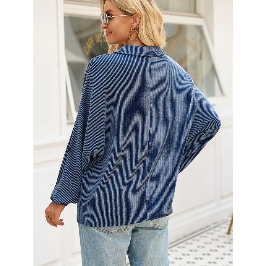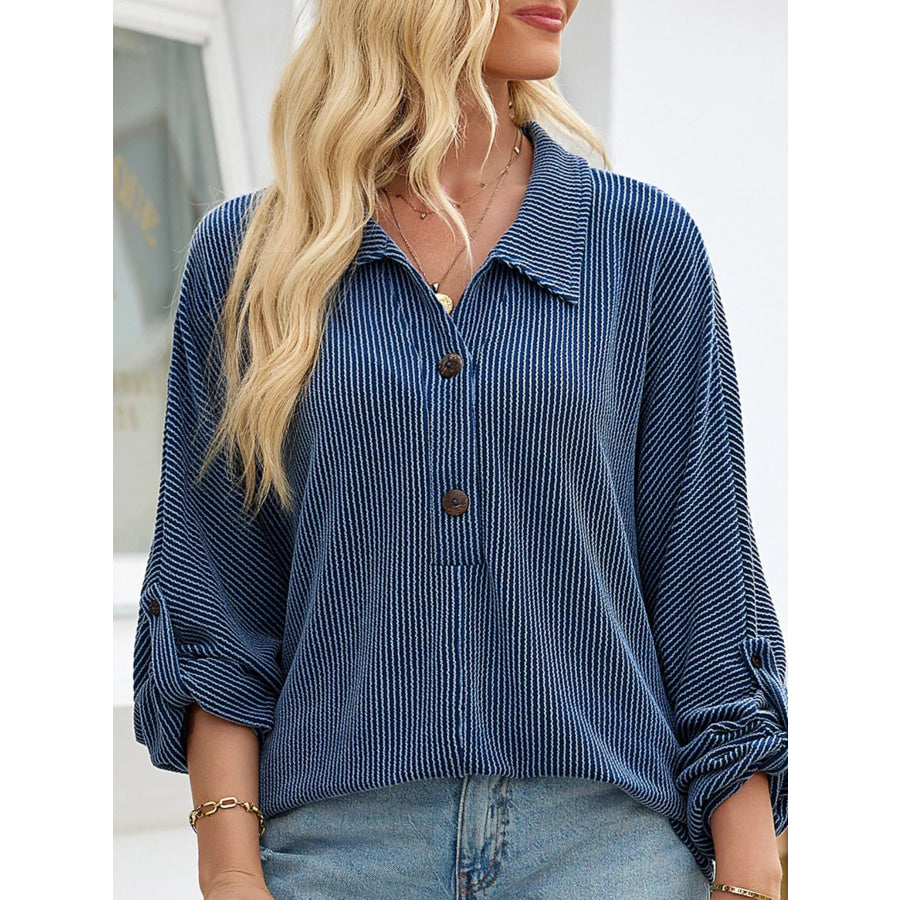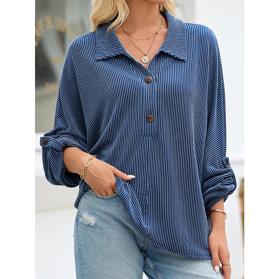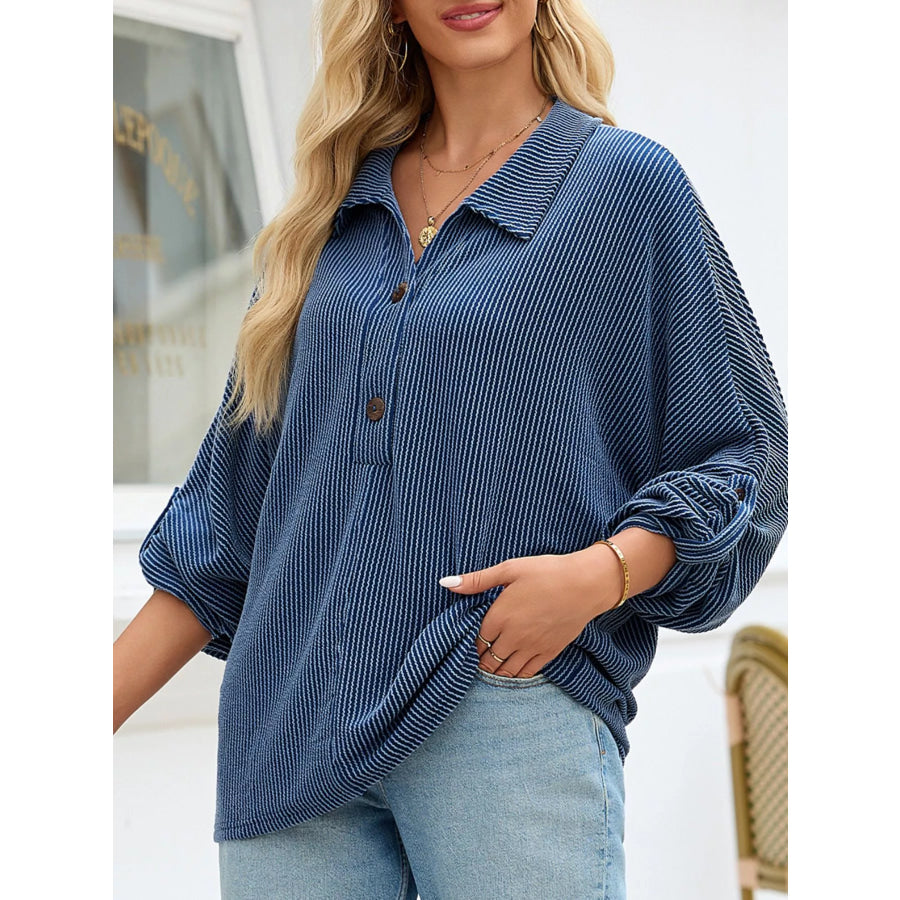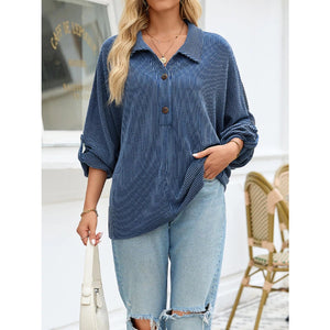 Oversized Twist Ribbed Collared Henley Top with Roll Up Sleeve