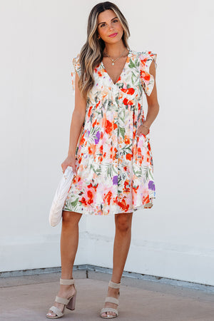 Pink Floral Double Ruffle Sleeve V Neck High Waist Mini Dress