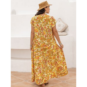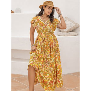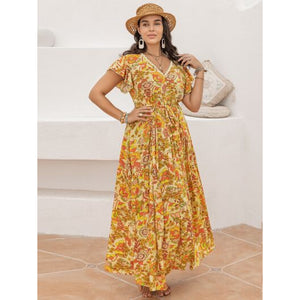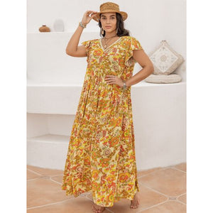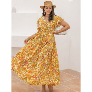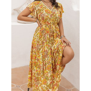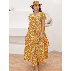 Plus Size Printed V-Neck Flutter Sleeve Tie Waist Maxi Dress
