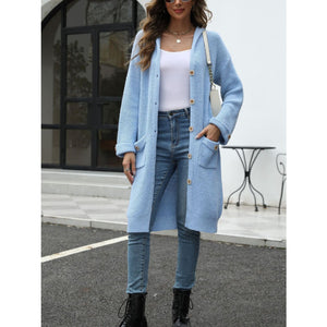 Pocketed Button Up Long Sleeve Hooded Cardigan