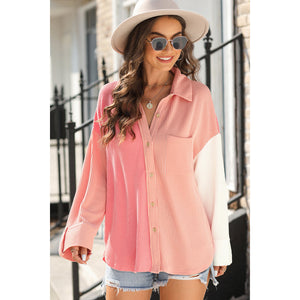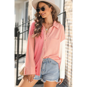 Pocketed Color Block Collared Neck Long Sleeve Shirt