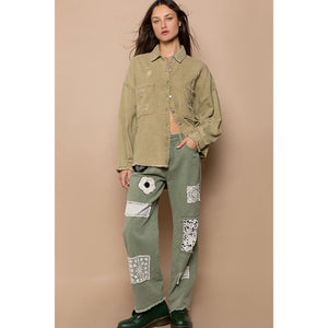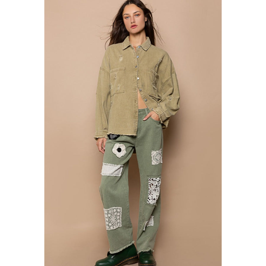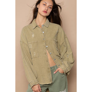 POL Button Down Raw Hem Distressed Shacket