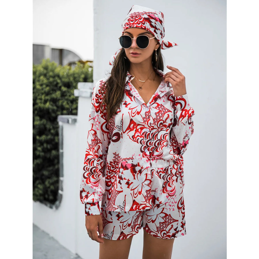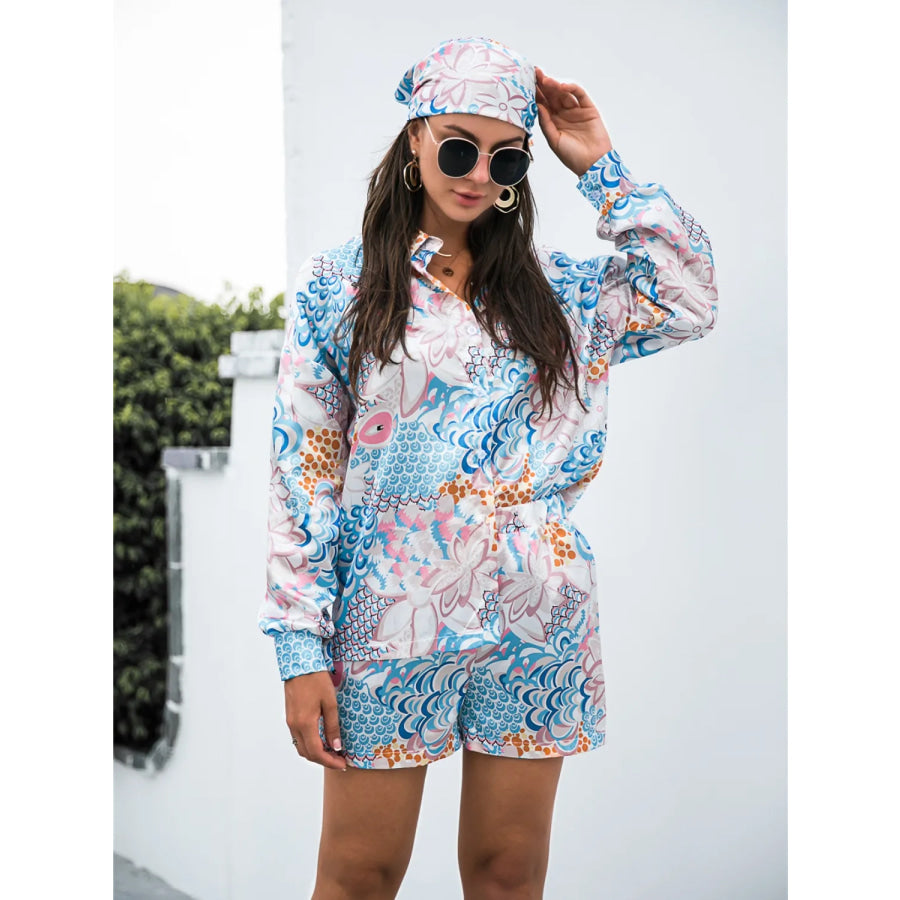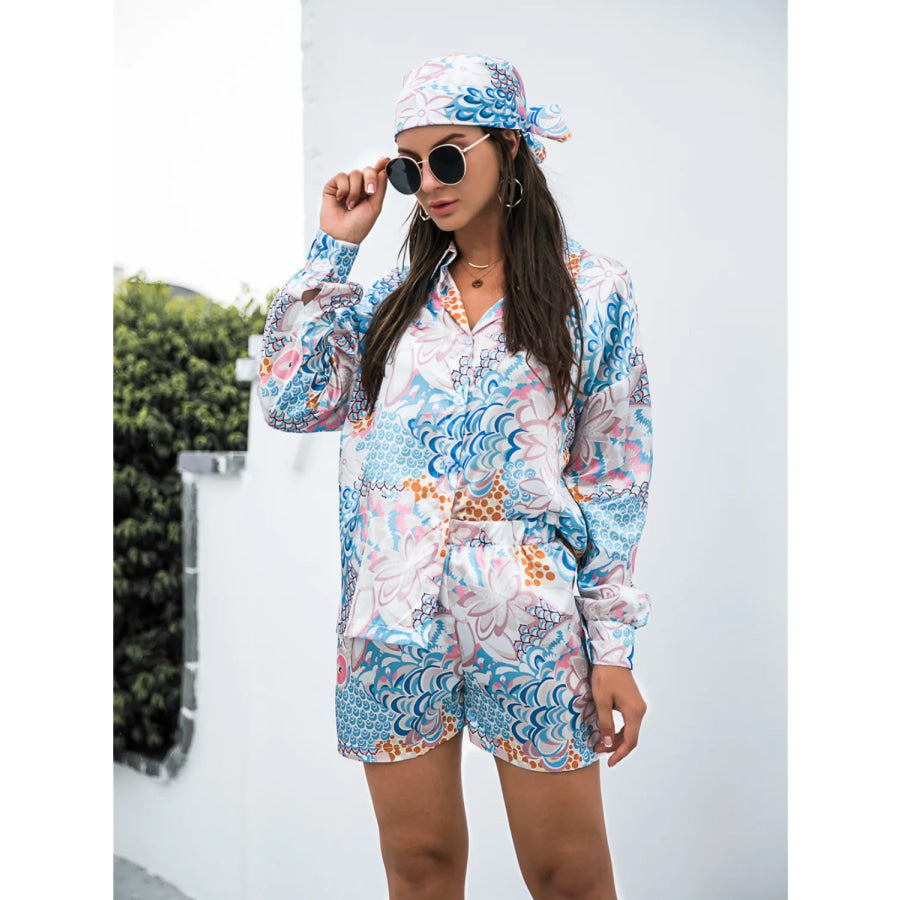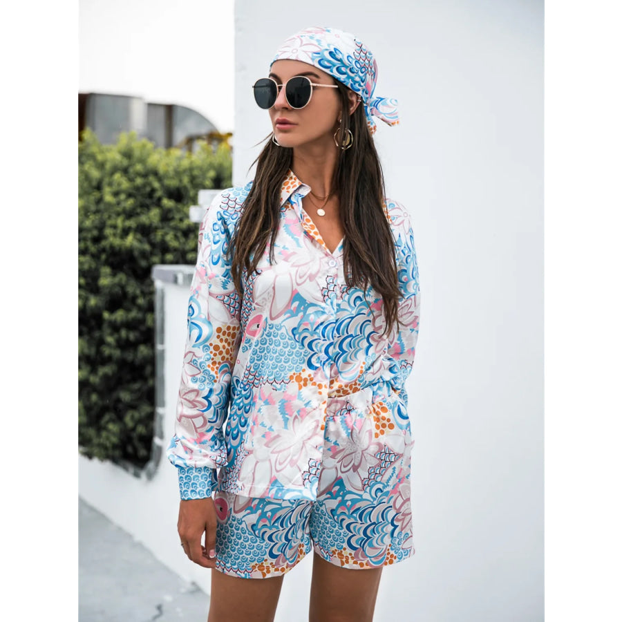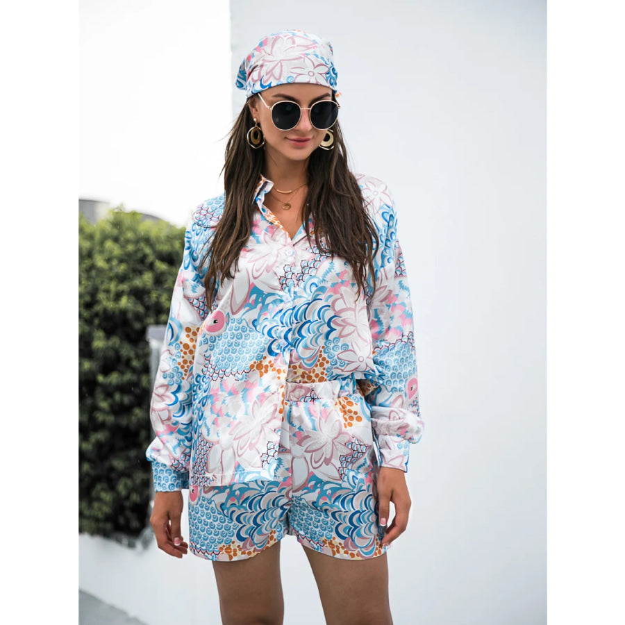 Printed Button Up Long Sleeve Shirt and Shorts Set