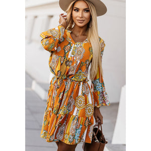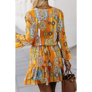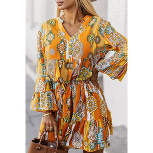 Printed Notched Neck Flounce Sleeve Dress