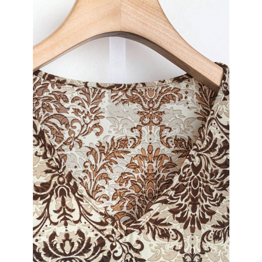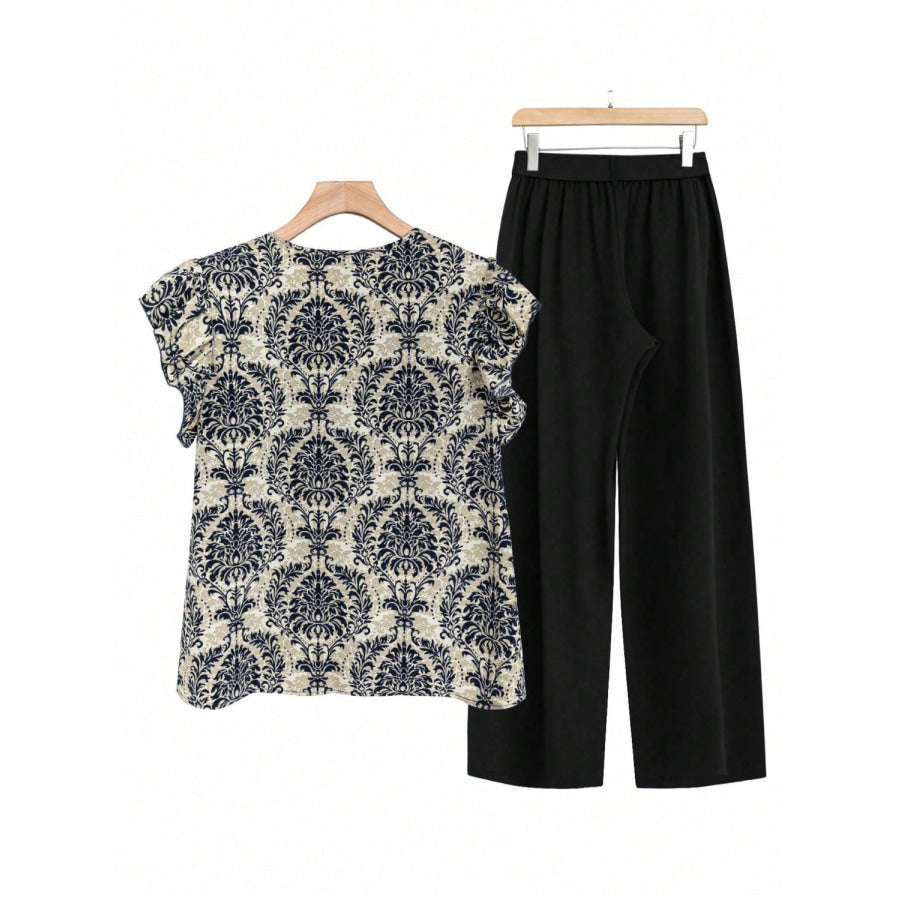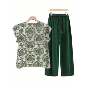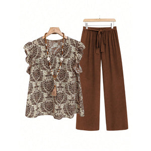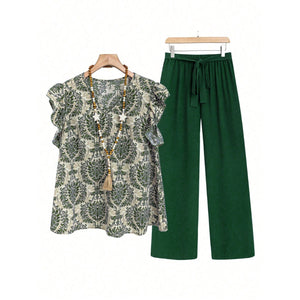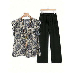 Printed Ruffled Cap Sleeve Top and Pants Set