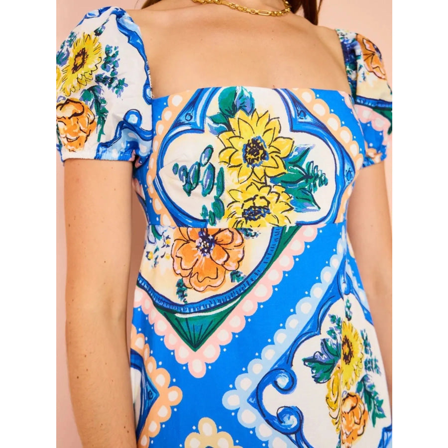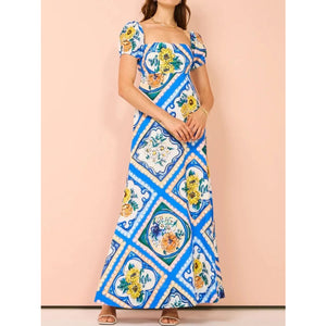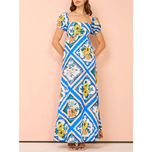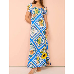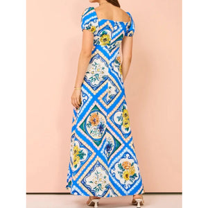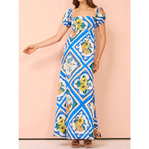 Printed Square Neck Puff Sleeve Maxi Dress