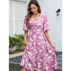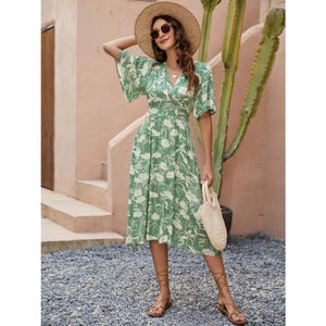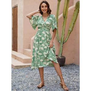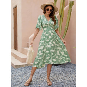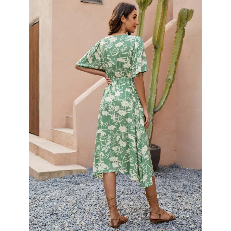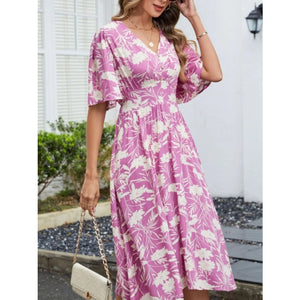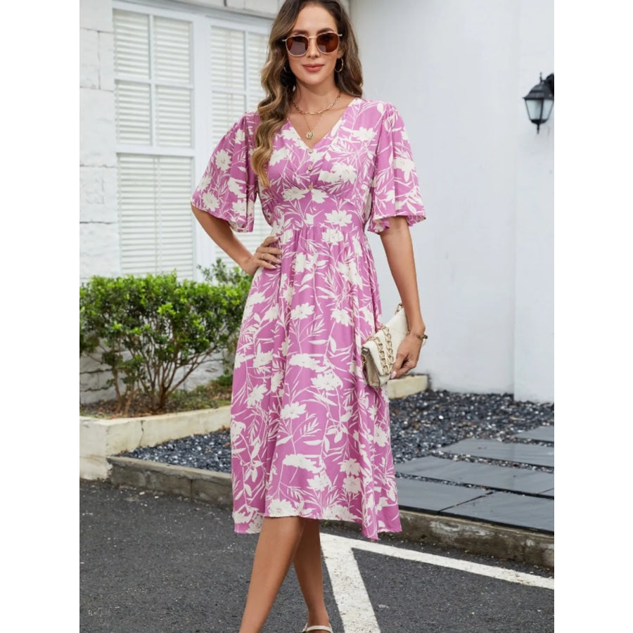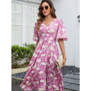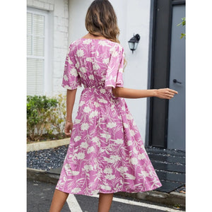 Printed V-Neck Flutter Sleeve Dress