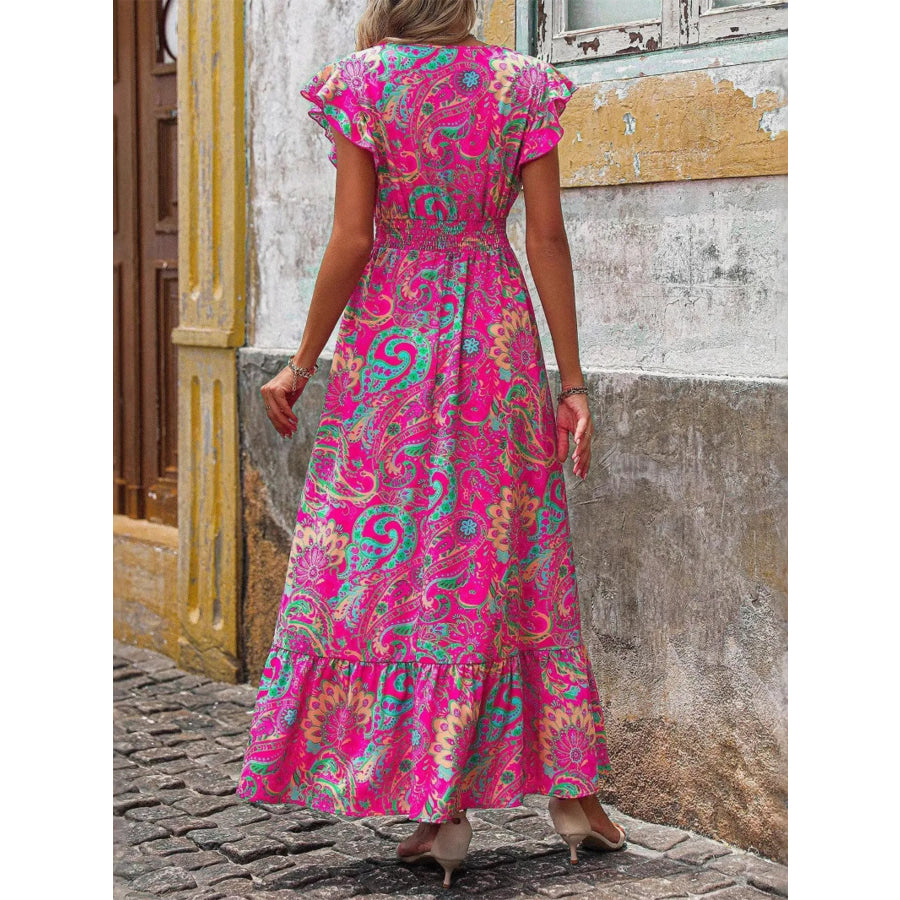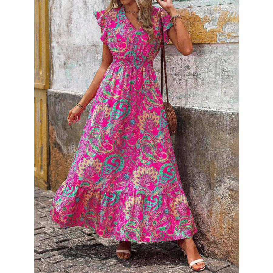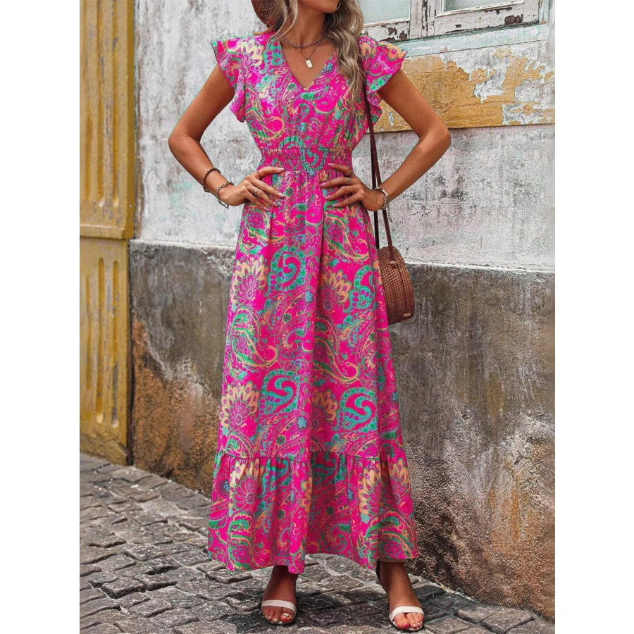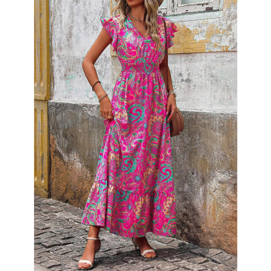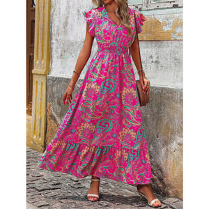 Printed V-Neck Ruffled Cap Sleeve Maxi Dress