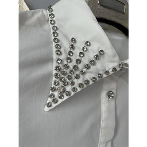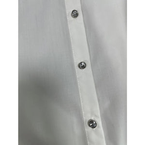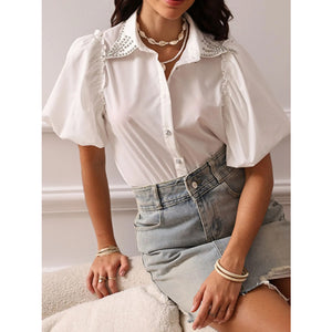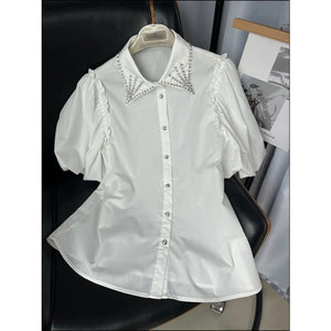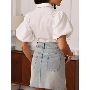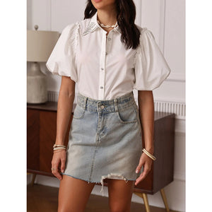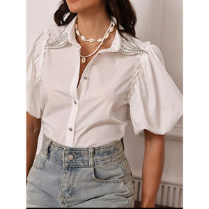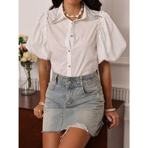 Puff Sleeve Button-Up Shirt with Rhinestone Detail