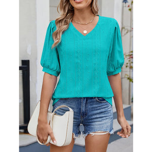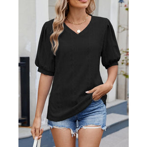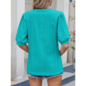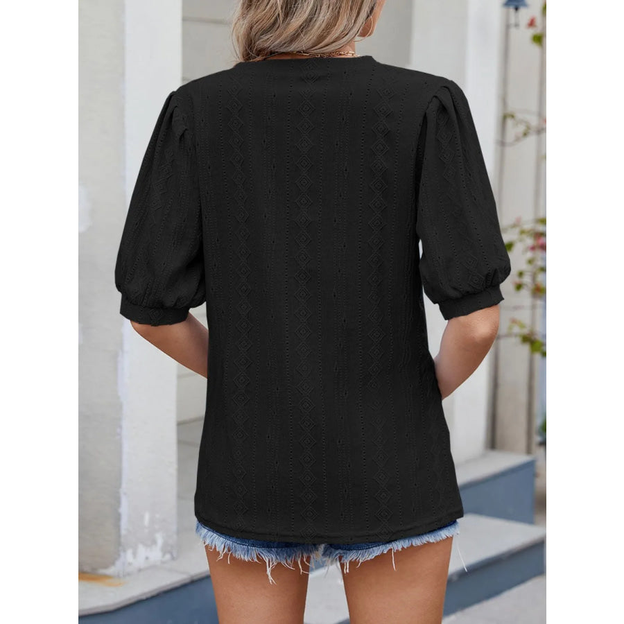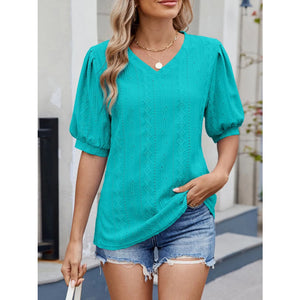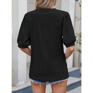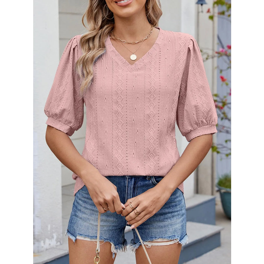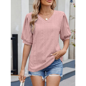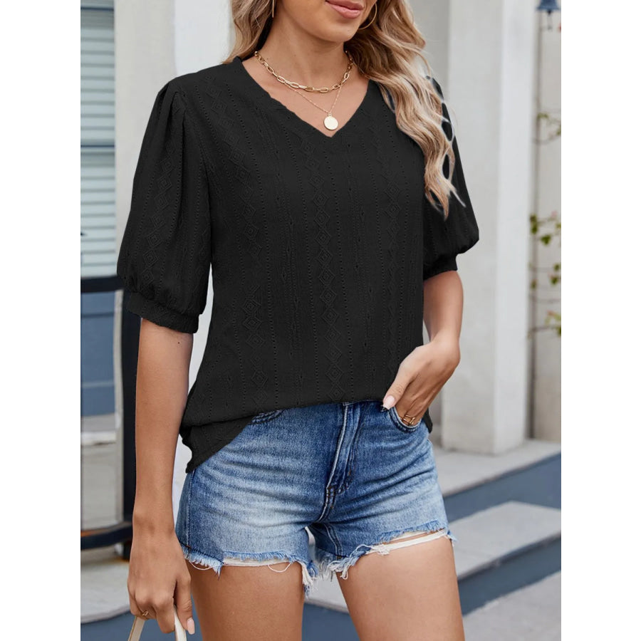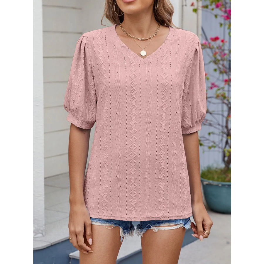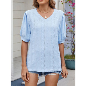 Puff Sleeve V-Neck Eyelet Lace T-Shirt