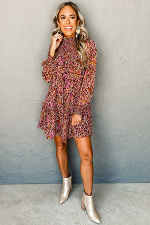 Red Floral Print Long Sleeve Shirred High Neck Loose Mini Dress