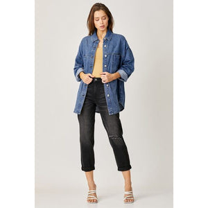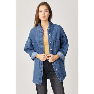 A Button Up Drop Shoulder Denim Shacket is a hybrid garment that combines the style of a shirt and a jacket. It typically features a button-up front like a shirt, along with drop shoulders, which are seams that sit below the natural shoulder line for a relaxed and slightly oversized fit. This shacket is made of denim fabric, providing a casual and versatile look that can be worn as a lightweight jacket or a shirt. It's a trendy and fashionable piece that can be layered over outfits for added style and warmth.