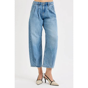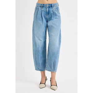 Thesestylishmidwaistedwidelegjeansfeaturearelaxedboyfriendfitwithelegantfrontpleatsthatcreateasophisticatedvintage-inspiredlook.Craftedfrompremiumcottondeniminabeautifullightbluewash,thesecroppedankle-lengthjeansofferbothcomfortandstyle.Perfectforcasualweekendsordressed upwithheelsforachiccontemporarylook.Theclassicfive-pocketstylingandqualityconstructionmakethesejeansaversatilewardrobeessential.