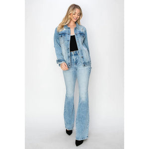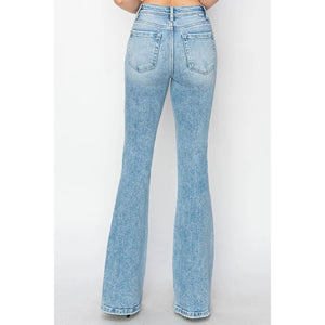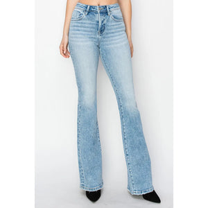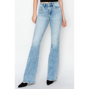 These stunning high-waisted flare jeans feature a classic light blue wash that perfectly captures timeless denim style. Crafted from premium cotton denim blend for comfort and durability, these jeans offer a flattering high-rise fit that accentuates the waistline while the dramatic flare leg creates an elongated silhouette. The vintage-inspired wash and fading details add authentic character, making them perfect for both casual and dressed-up occasions. The fitted design through the hips and thighs transitions seamlessly into a bold flare that's both retro and contemporary.