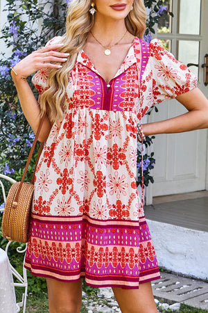 Rose Boho Floral Short Sleeve Lace-up V Neck Mini Dress