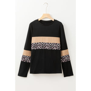 Rose Leopard Colorblock Patchwork Crew Neck Long Sleeve Tee