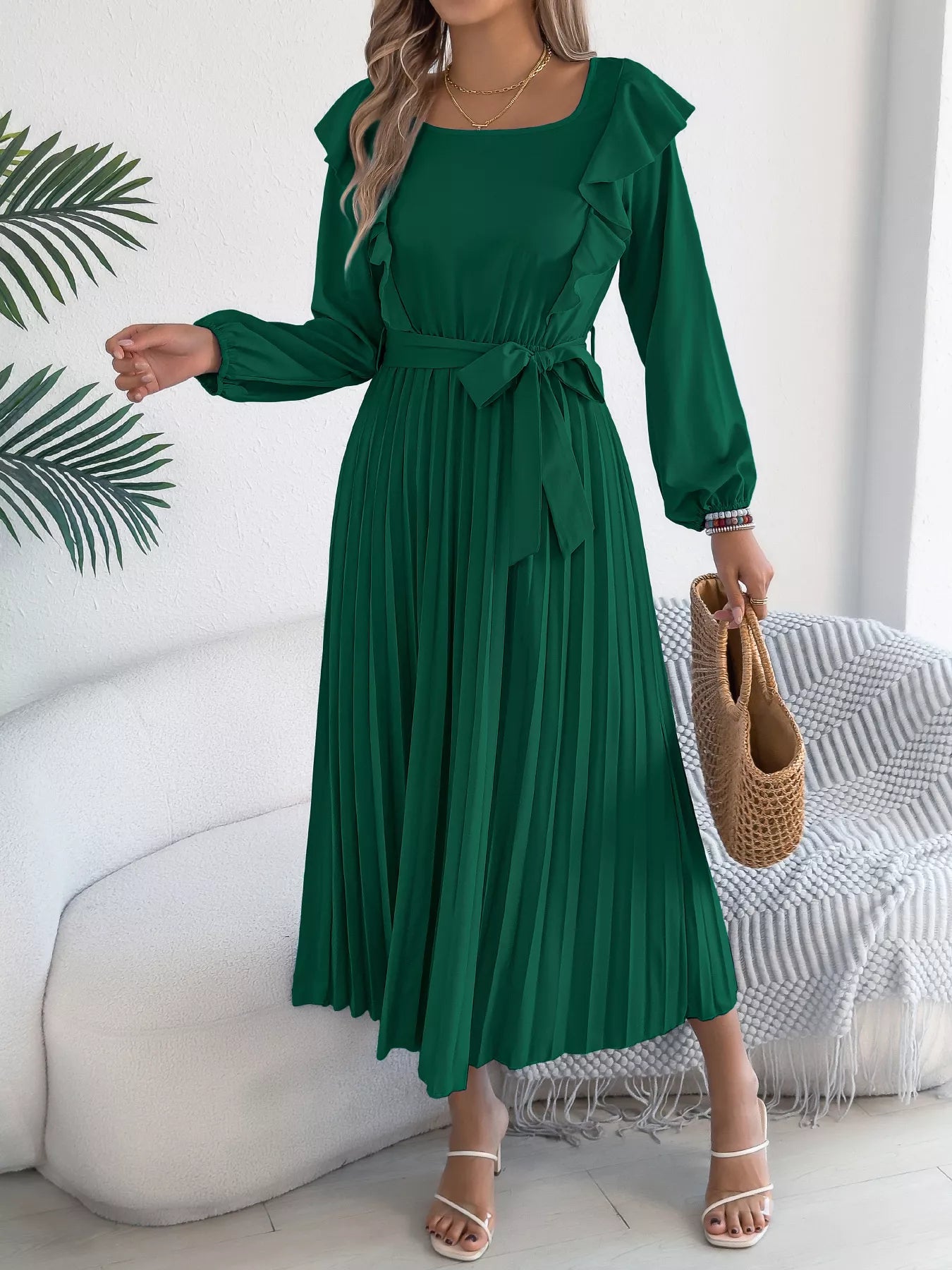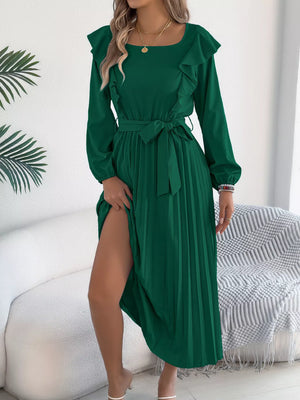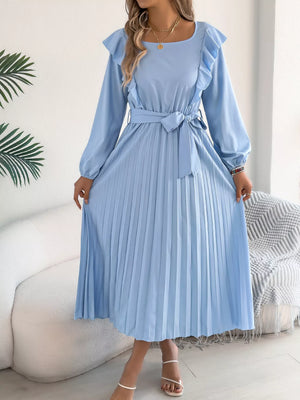Ruffle Trim Pleated A-Line Midi Dress