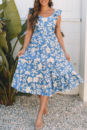 Sky Blue Floral U Neck Flutter Shoulder Tiered Flowy Midi Dress