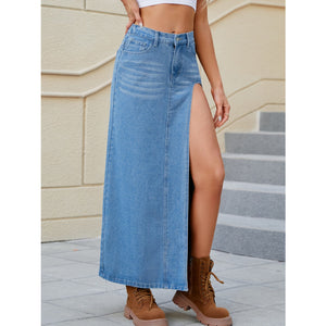 Slit Buttoned Denim Skirt with Pockets