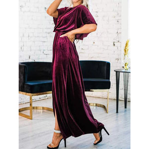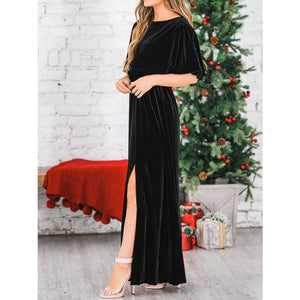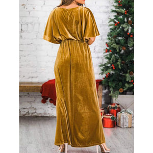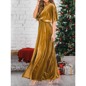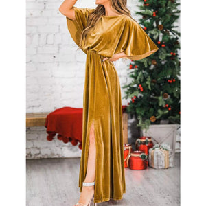 Slit Round Neck Flutter Sleeve Velvet Maxi Dress