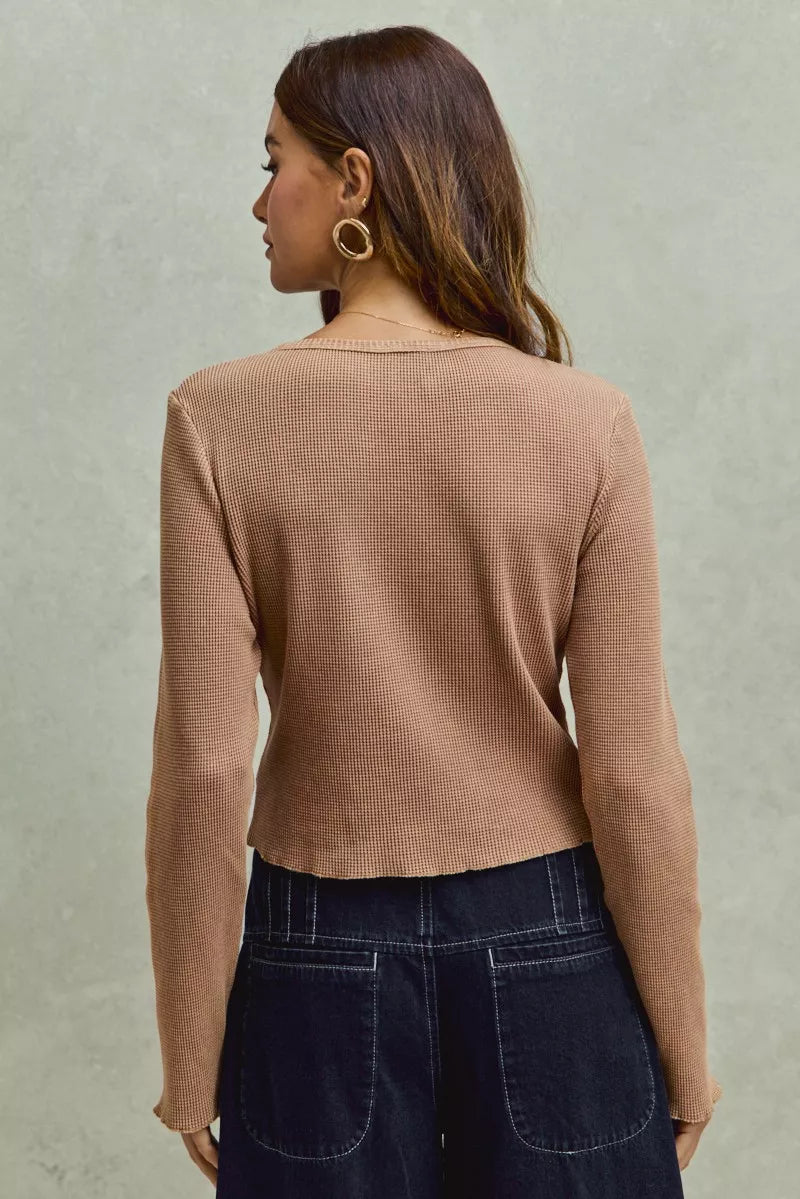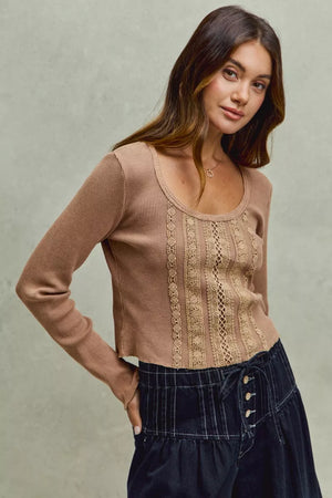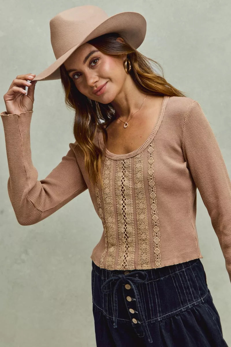 SO ME Vintage Washed Lace Crop Thermal Washed Knit Top