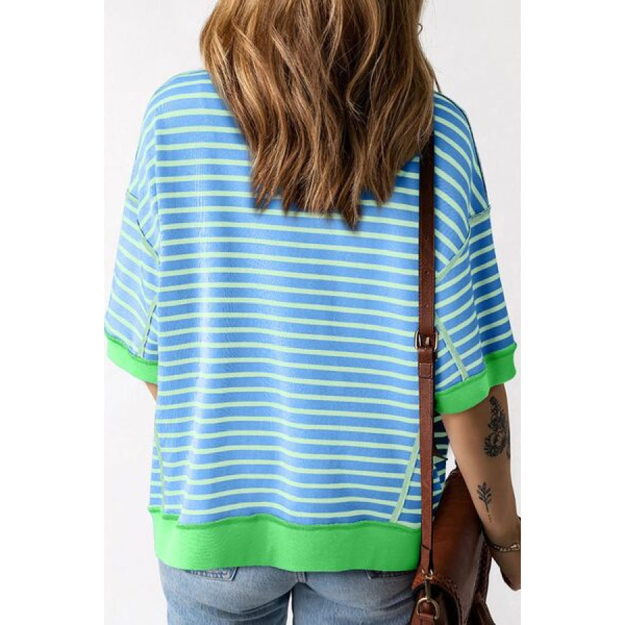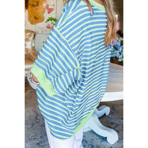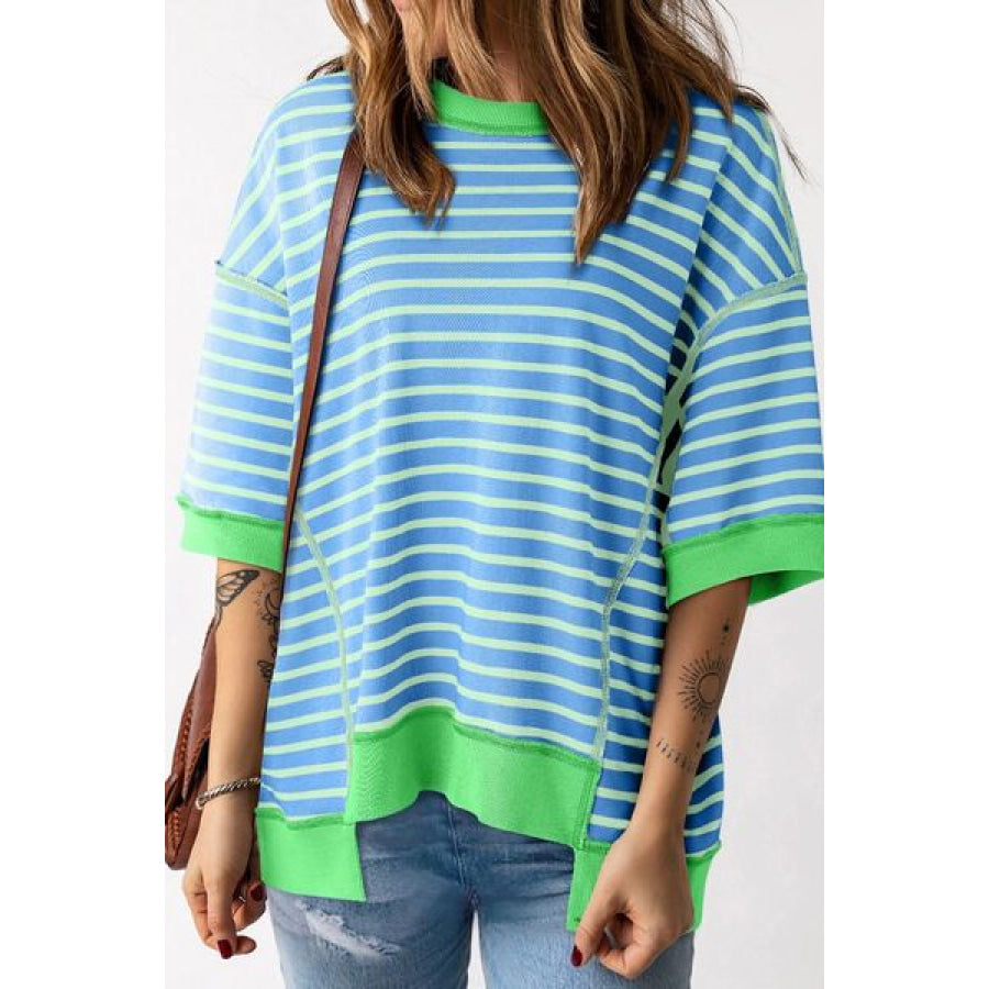 Stripe Oversized Contrast Trim Exposed Seam High Low T Shirt